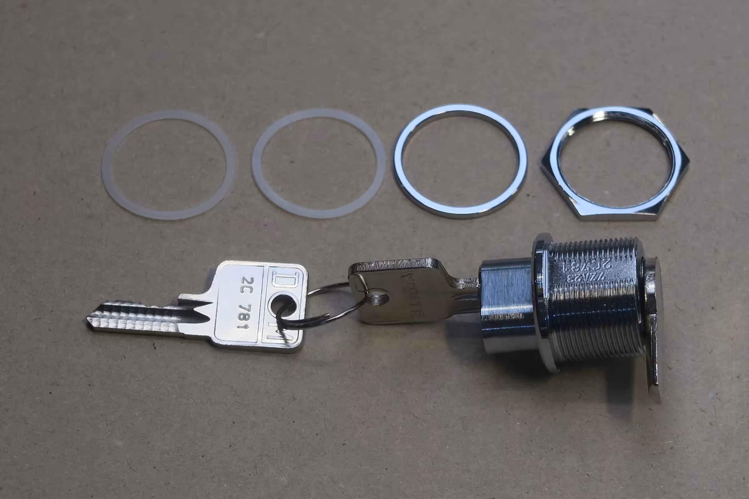 2 x Schlüssel, 1 x Mutter, 1 x Distanzring, 2 x Kunststoffring