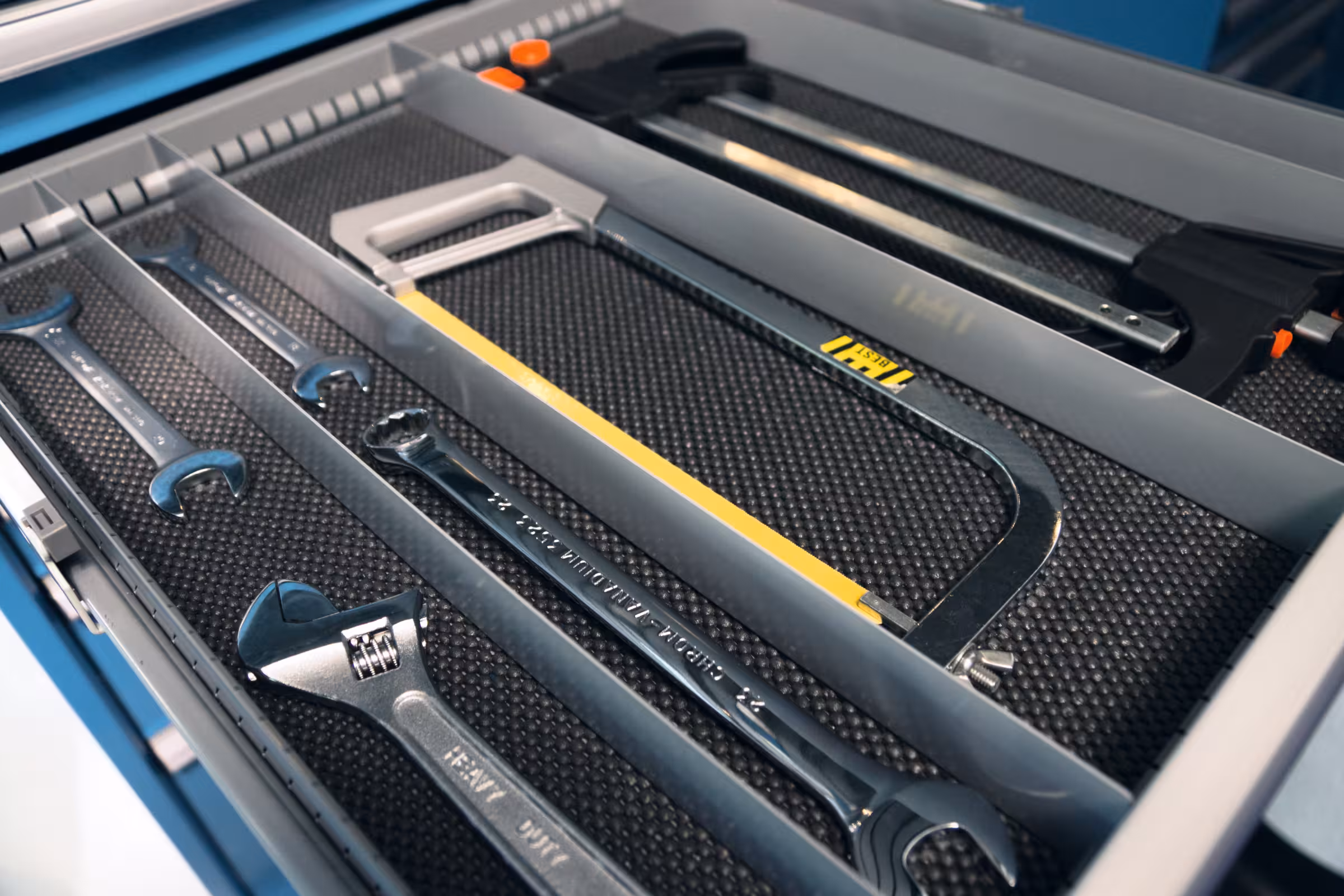 Trennwände: Für Längs- und Querteilung der Schubladen. Die untere Abkantung ermöglicht ein Verschrauben mit dem gelochten Schubladen-Boden. Inklusive Verschraubungsmaterial. Ausführung: Stahlblech ERLOX.