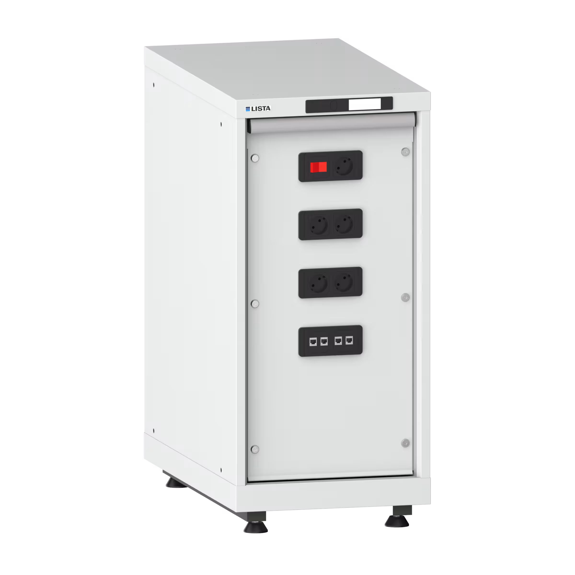 1 x Schalter / Steckdose 230 V, 2 x 2 Steckdosen 230 V, 2 x 2 Netzwerkdosen RJ45, 4 Nivellierfüsse