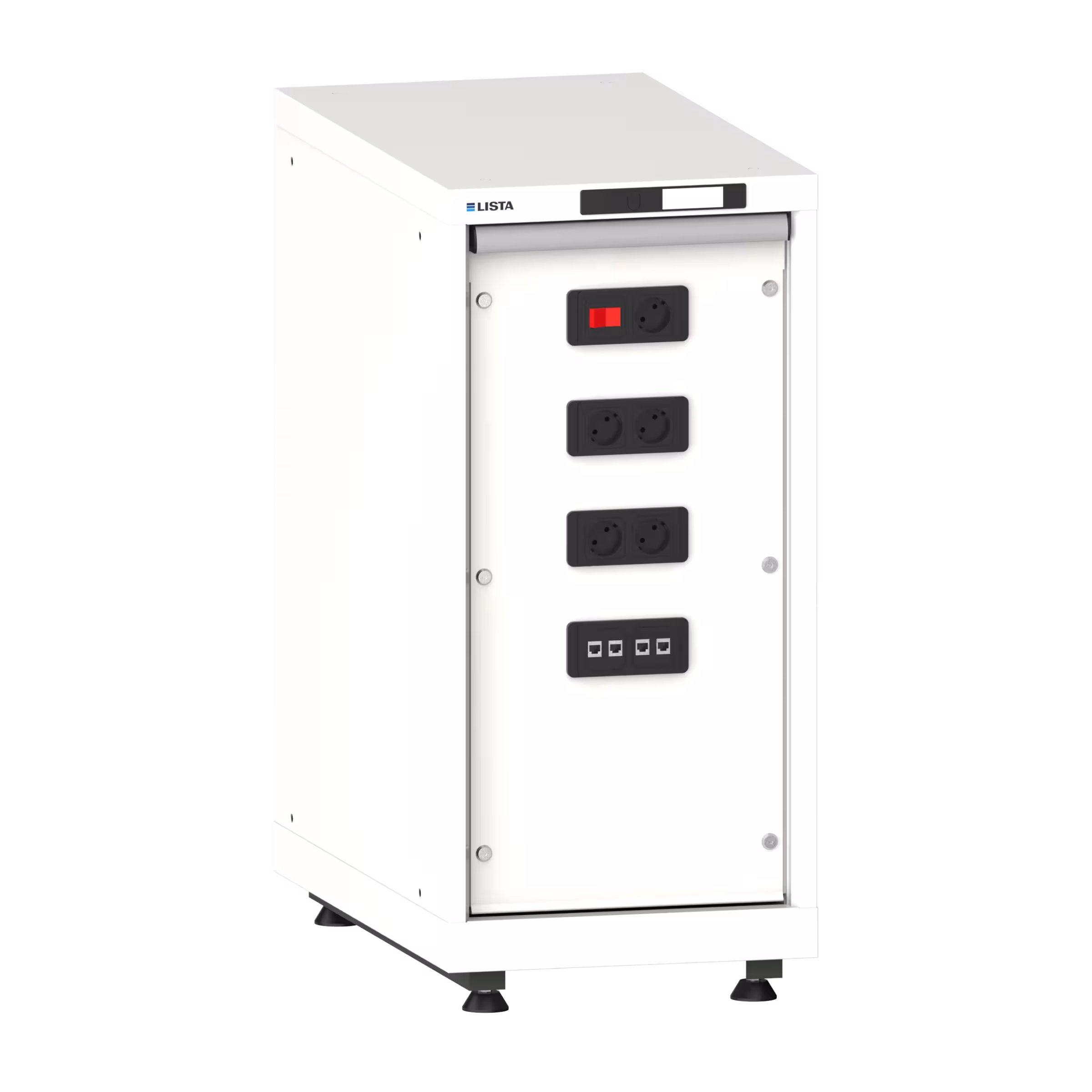 1 x Schalter / Steckdose 230 V, 2 x 2 Steckdosen 230 V, 2 x 2 Netzwerkdosen RJ45, 4 Nivellierfüsse