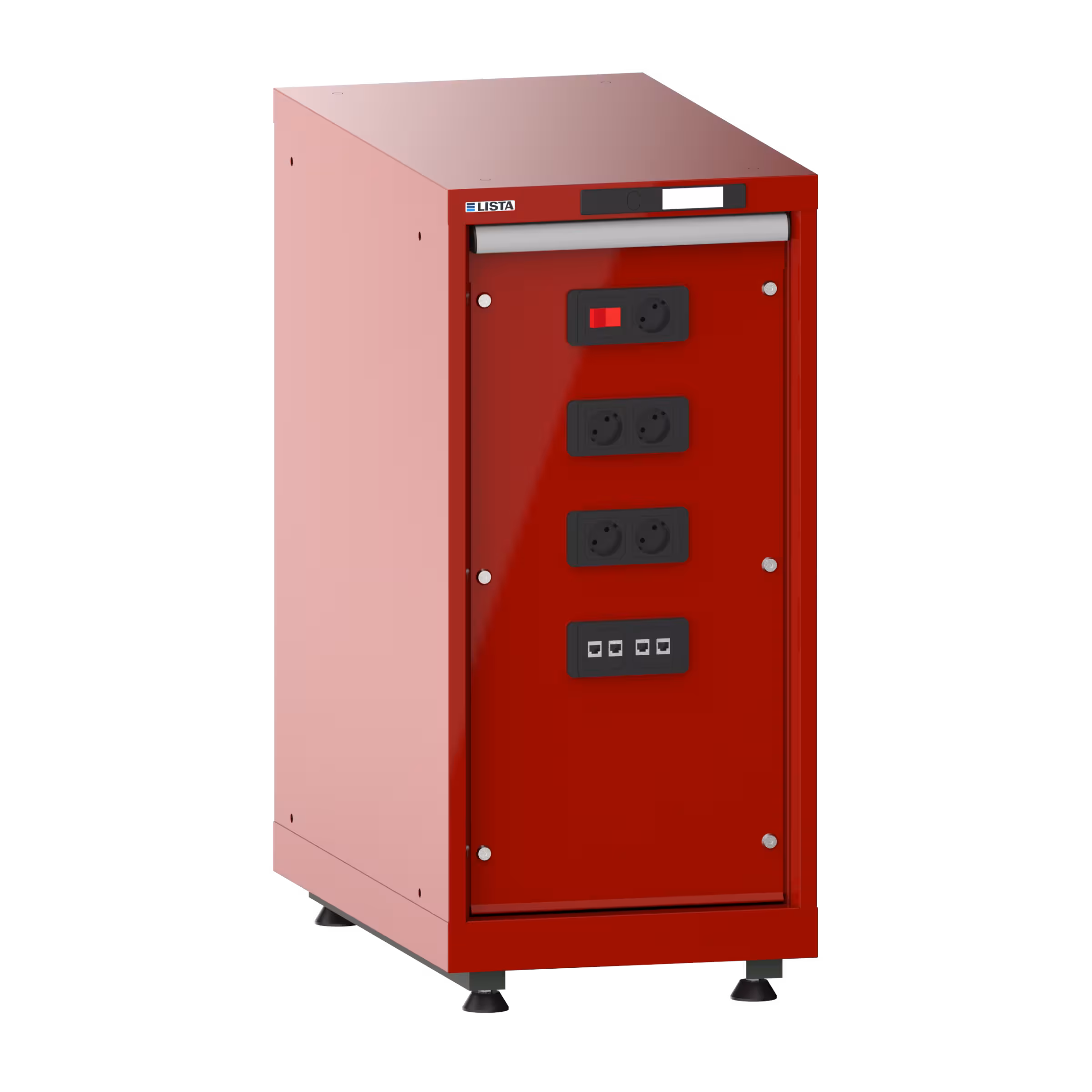 Energiemodulschrank 18x36E (BxTxH) 411x725x895-940mm Netzwerkdosen RJ45 inkl. Nivellierfuss-Set für Blenden (4 x Füsse, 45-90mm) Typ D/Schuko Rubinrot RAL 3003