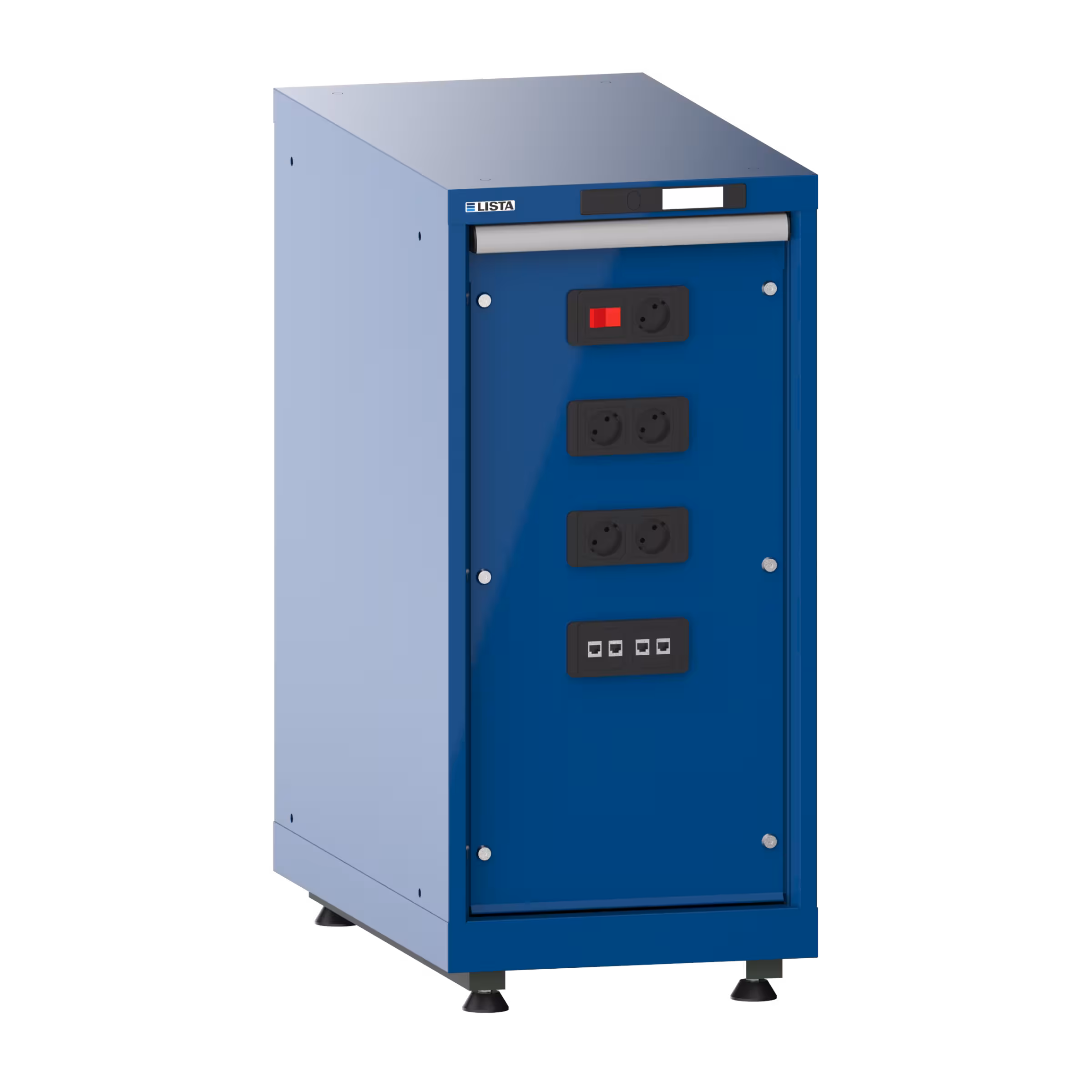 Energiemodulschrank 18x36E (BxTxH) 411x725x895-940mm Netzwerkdosen RJ45 inkl. Nivellierfuss-Set für Blenden (4 x Füsse, 45-90mm) Typ D/Schuko Signalblau RAL 5005
