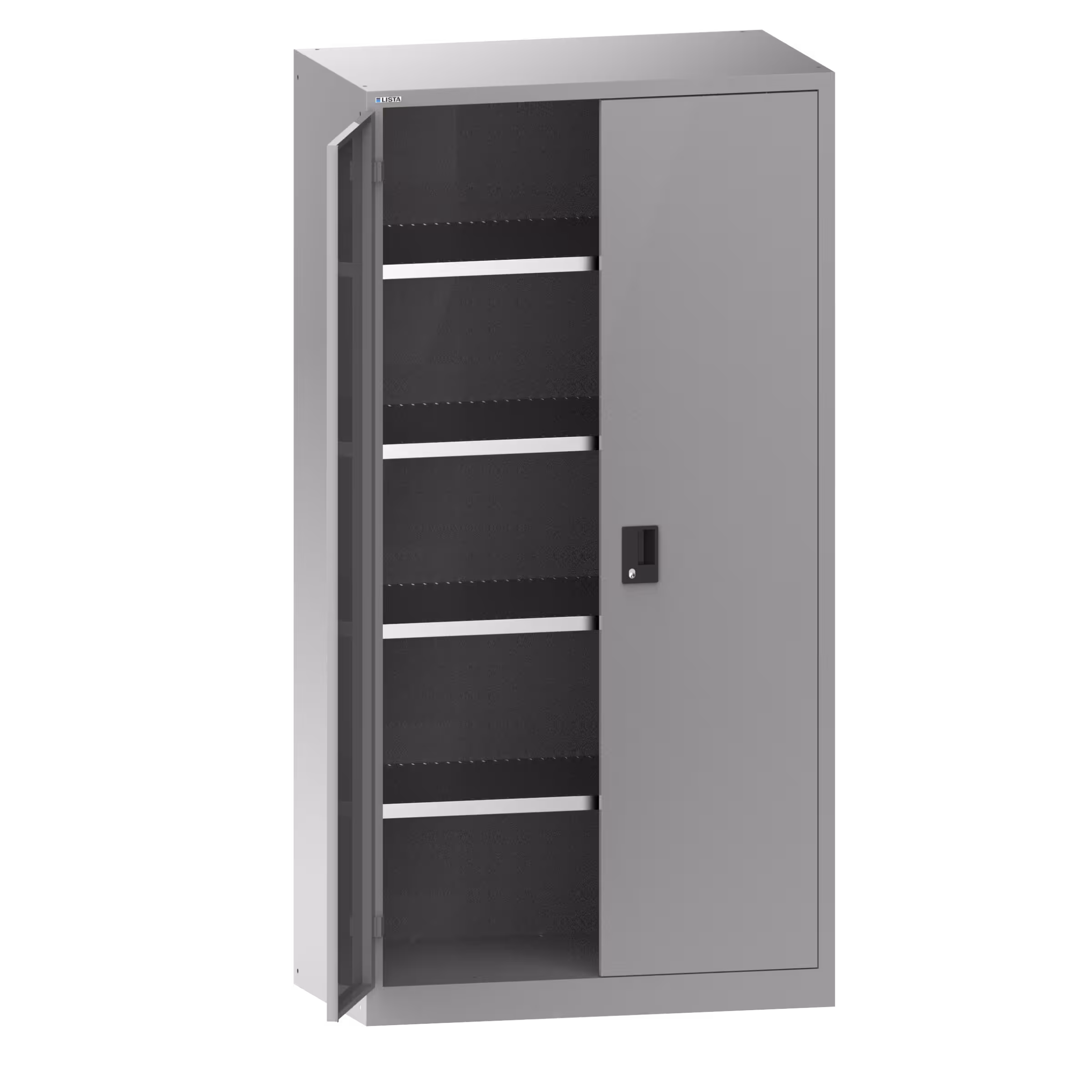 Flügeltürschrank mit 2 Vollblech-Türen Scharnierlagerung (BxTxH) 1000x580x1950mm 4 Verstellböden KEY Lock Weissaluminium RAL 9006