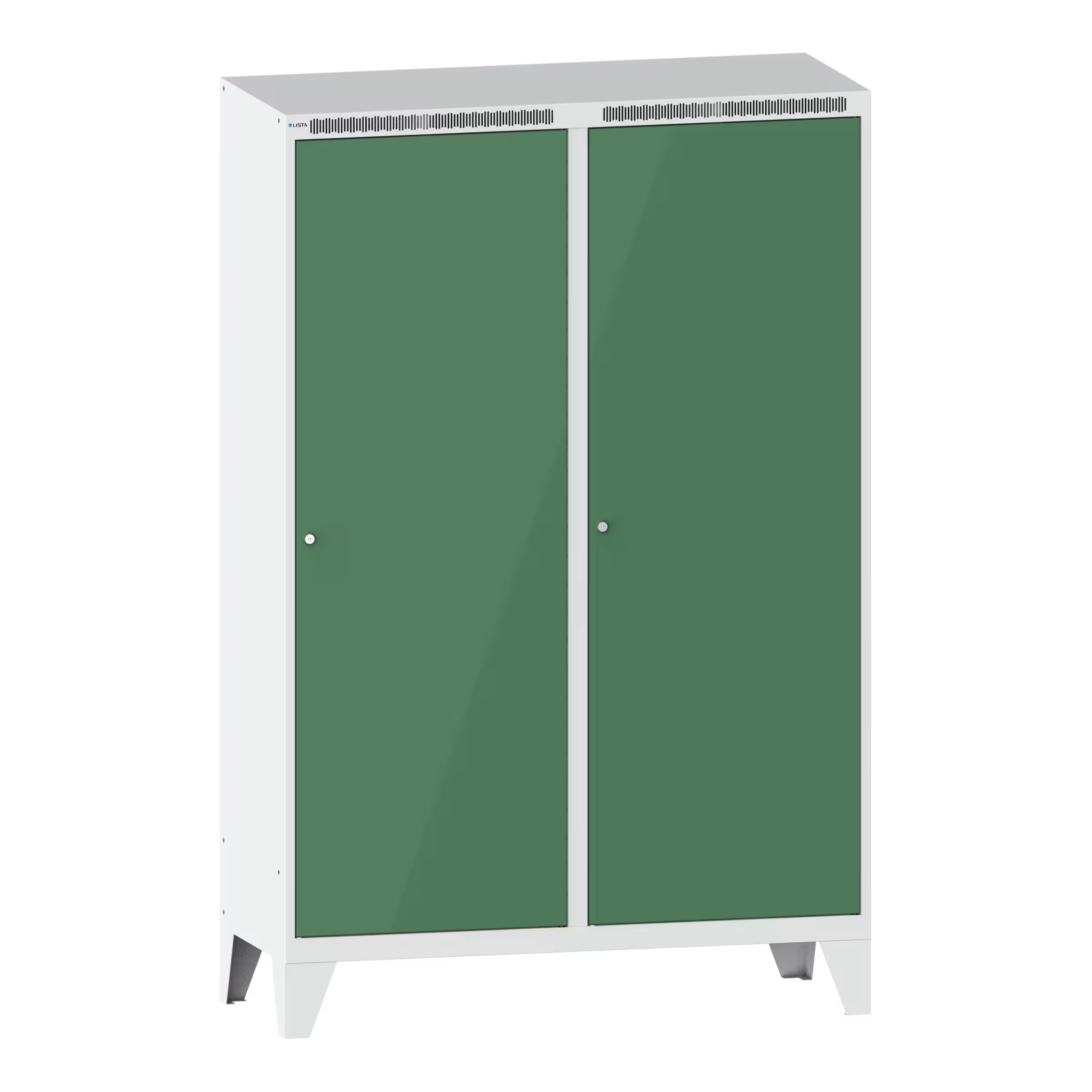 Garderobenschrank (BxTxH) 1200x500x1850mm 4 Abteile mit Füssen, Türen glatt, KEY Lock Lichtgrau RAL 7035 / Resedagrün RAL 6011