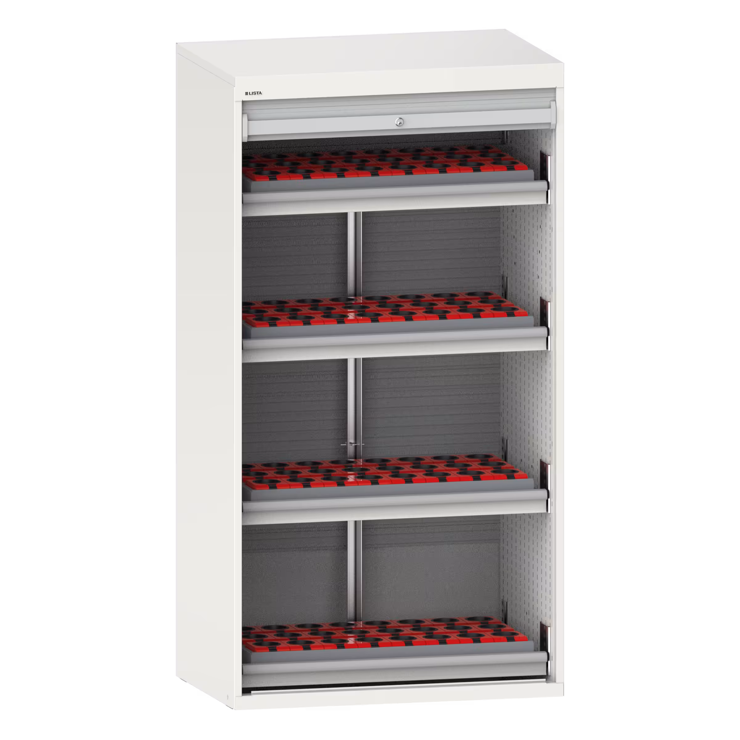 Schrankgehäuse: Die Gehäuse sind mit doppelwandigen, innen geschlitzten Seitenwänden zum Einhängen von Auszug- und Verstellböden, Schubladen und Werkzeugwechselrahmen ausgestattet. Der Verstellbereich ist im 25 mm-Raster unterteilt. Ausführung: Stahlblech.