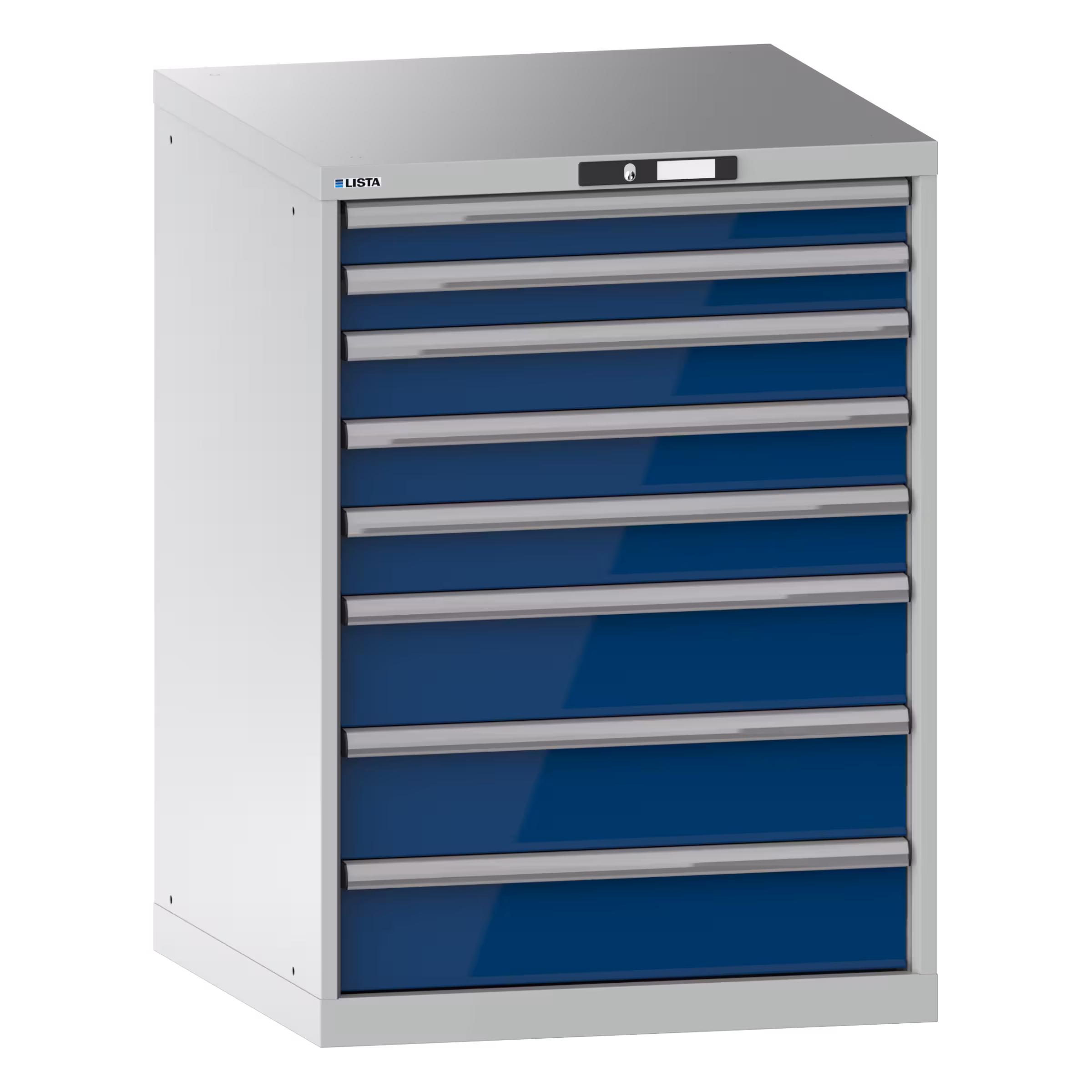 Schubladenschrank 36x36E (BxTxH) 717x725x1000mm 8 Schubladen (2x75/3x100/3x150) 75kg KEY Lock Lichtgrau RAL 7035 / Signalblau RAL 5005