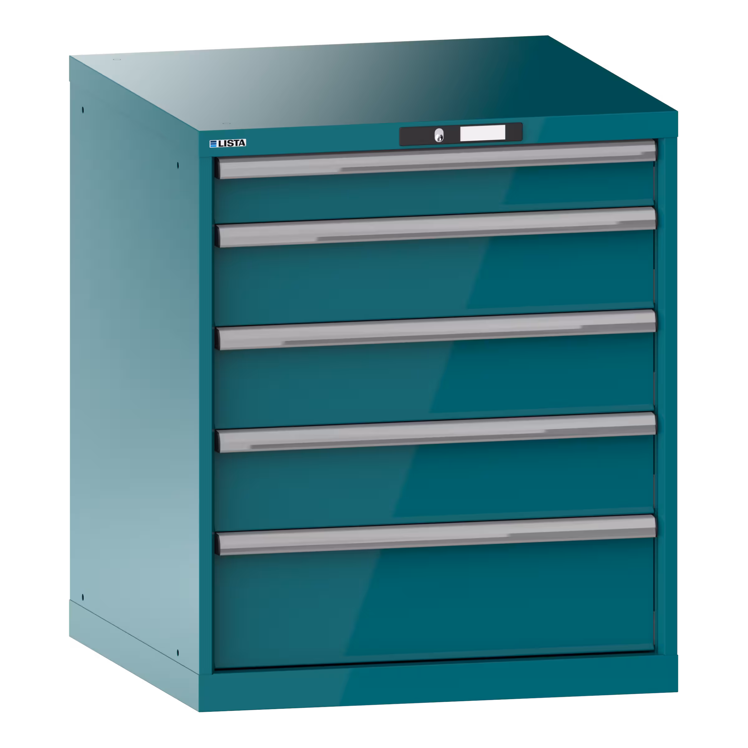 Schubladenschrank 36x36E (BxTxH) 717x725x850mm 5 Schubladen (1x100/3x150/1x200) 75kg KEY Lock Türkisblau RAL 5018
