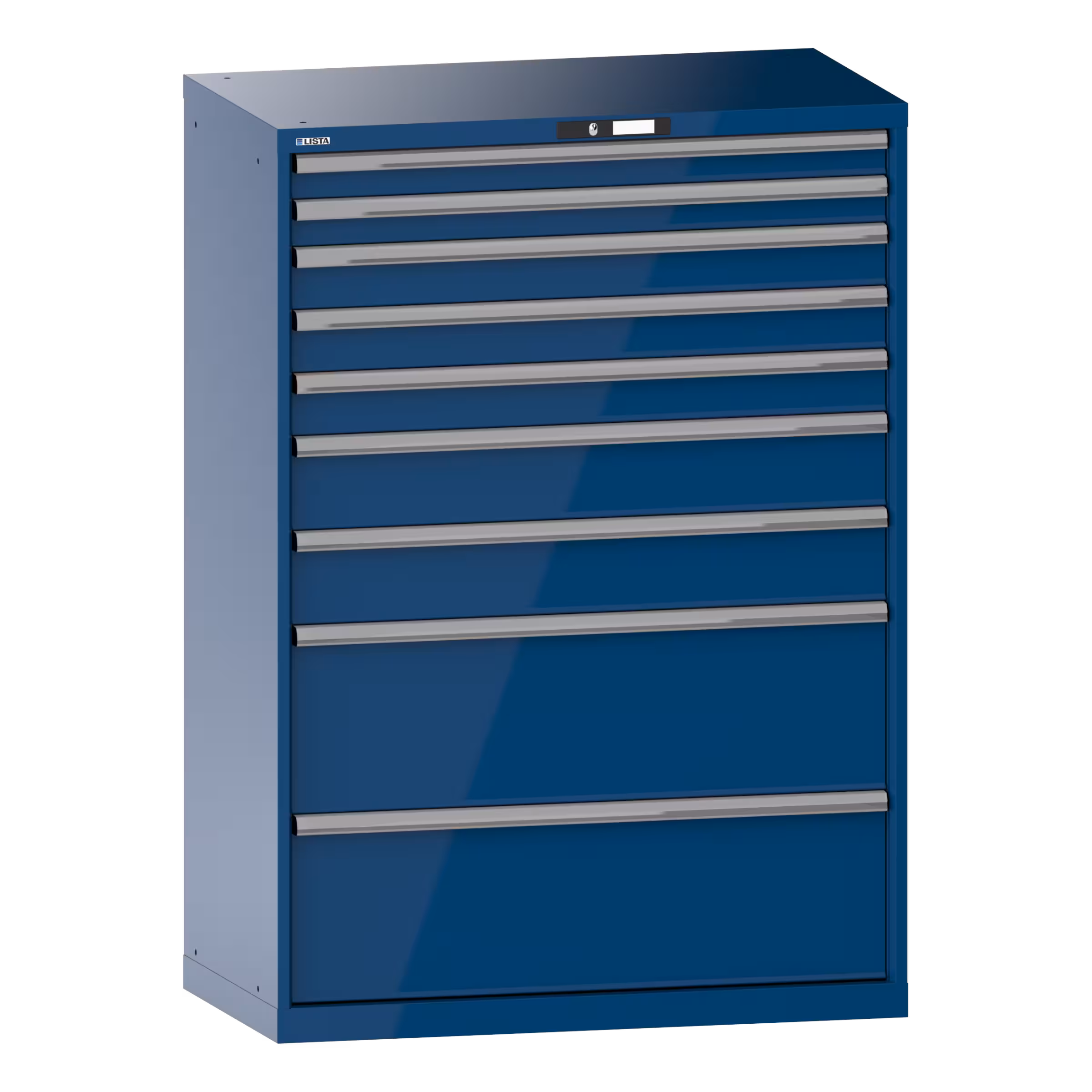 Schubladenschrank 54x27E (BxTxH) 1023x572x1450mm 10 Schubladen (2x75/3x100/2x150/3x200) 200kg CODE Lock Enzianblau RAL 5010