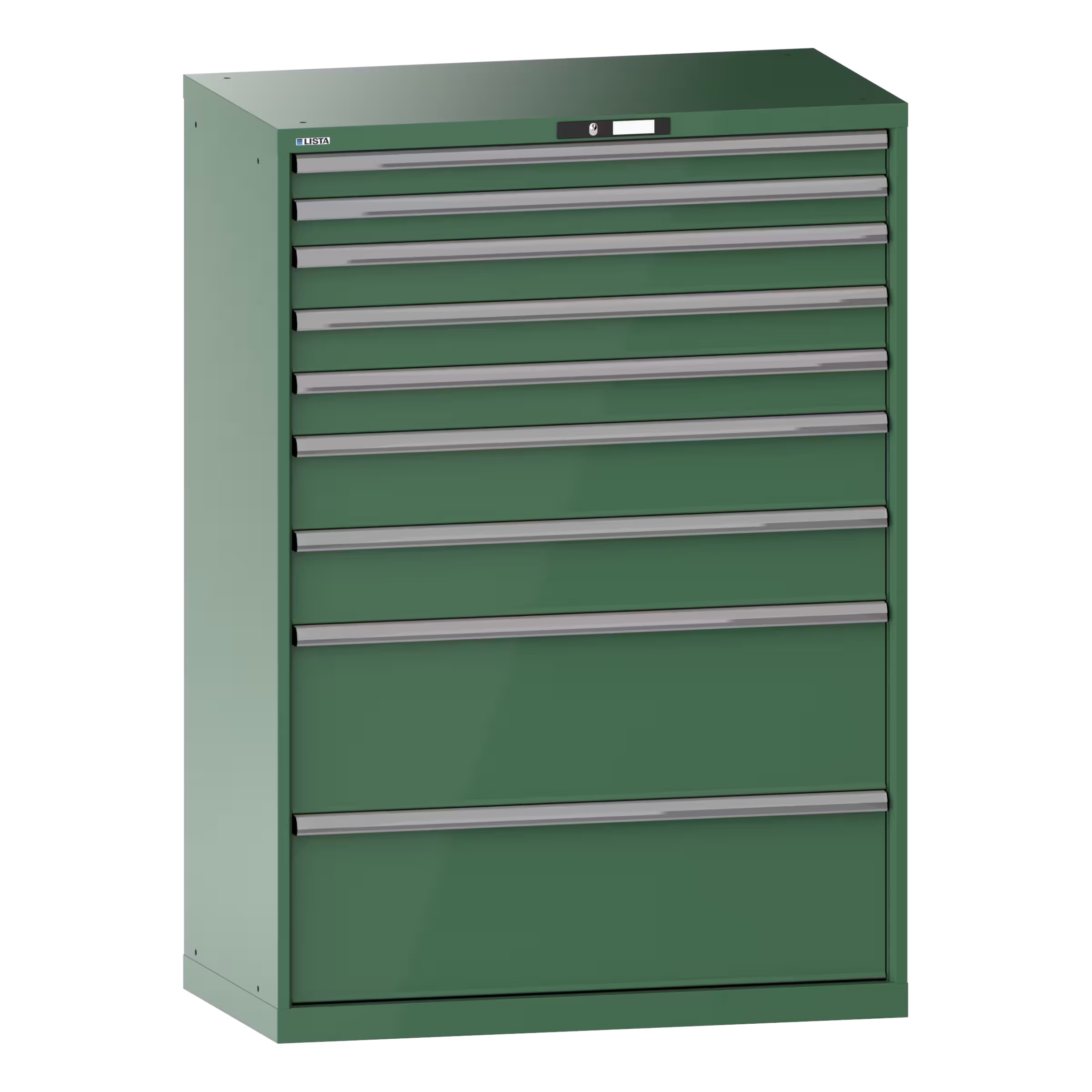 Schubladenschrank 54x27E (BxTxH) 1023x572x1450mm 10 Schubladen (2x75/3x100/2x150/3x200) 200kg CODE Lock Resedagrün RAL 6011