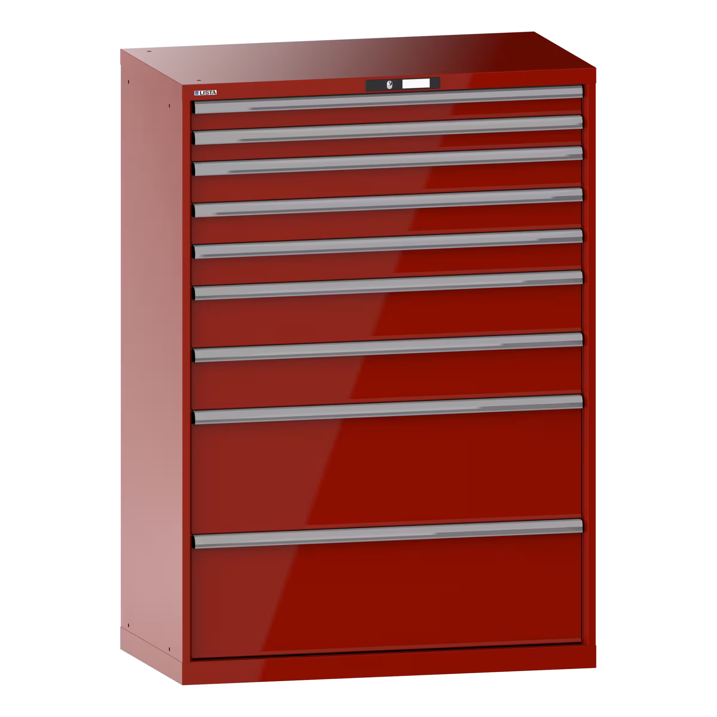 Schubladenschrank 54x27E (BxTxH) 1023x572x1450mm 10 Schubladen (2x75/3x100/2x150/3x200) 200kg CODE Lock Rubinrot RAL 3003