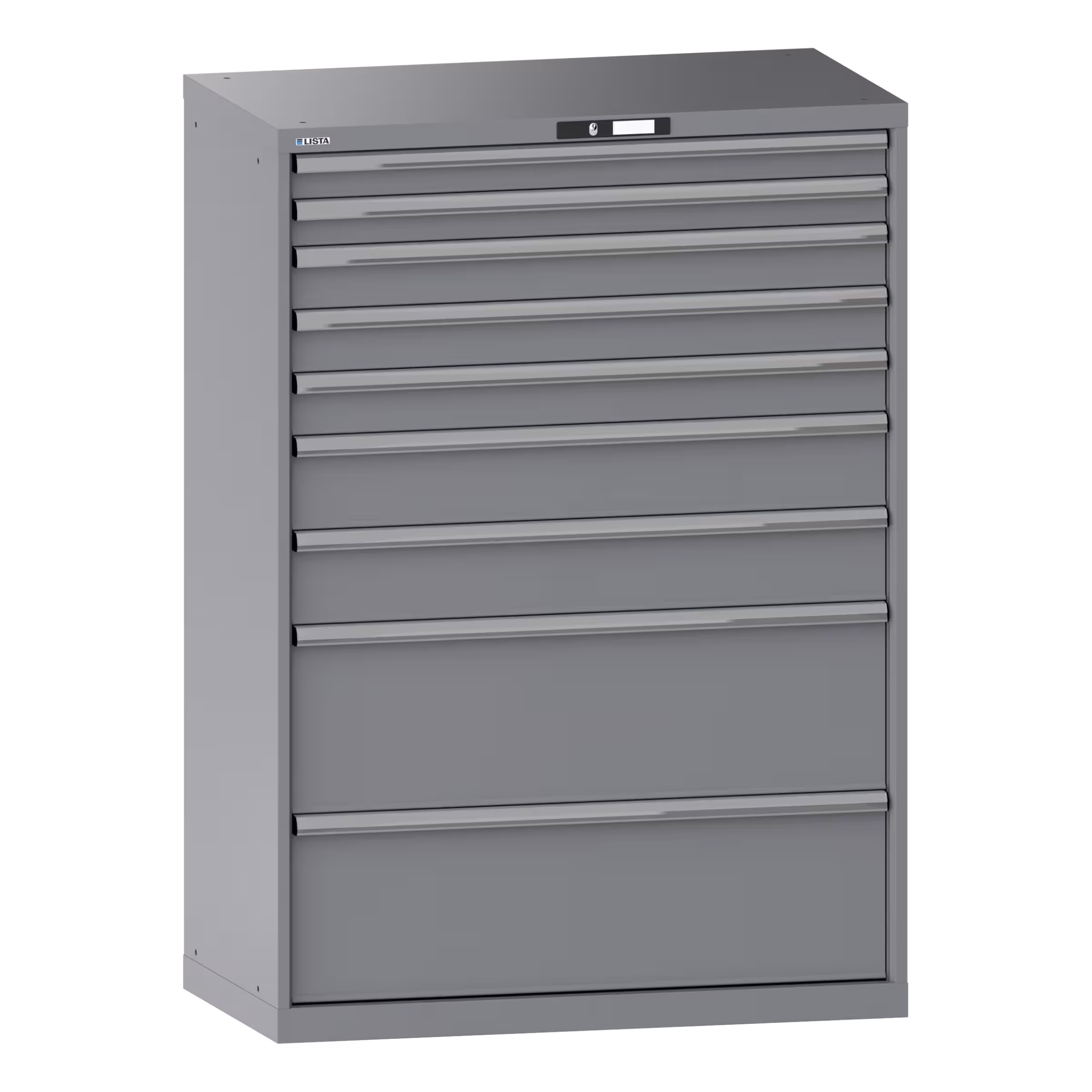 Schubladenschrank 54x27E (BxTxH) 1023x572x1450mm 10 Schubladen (2x75/3x100/2x150/3x200) 200kg CODE Lock Taubengrau NCS S 4502-B