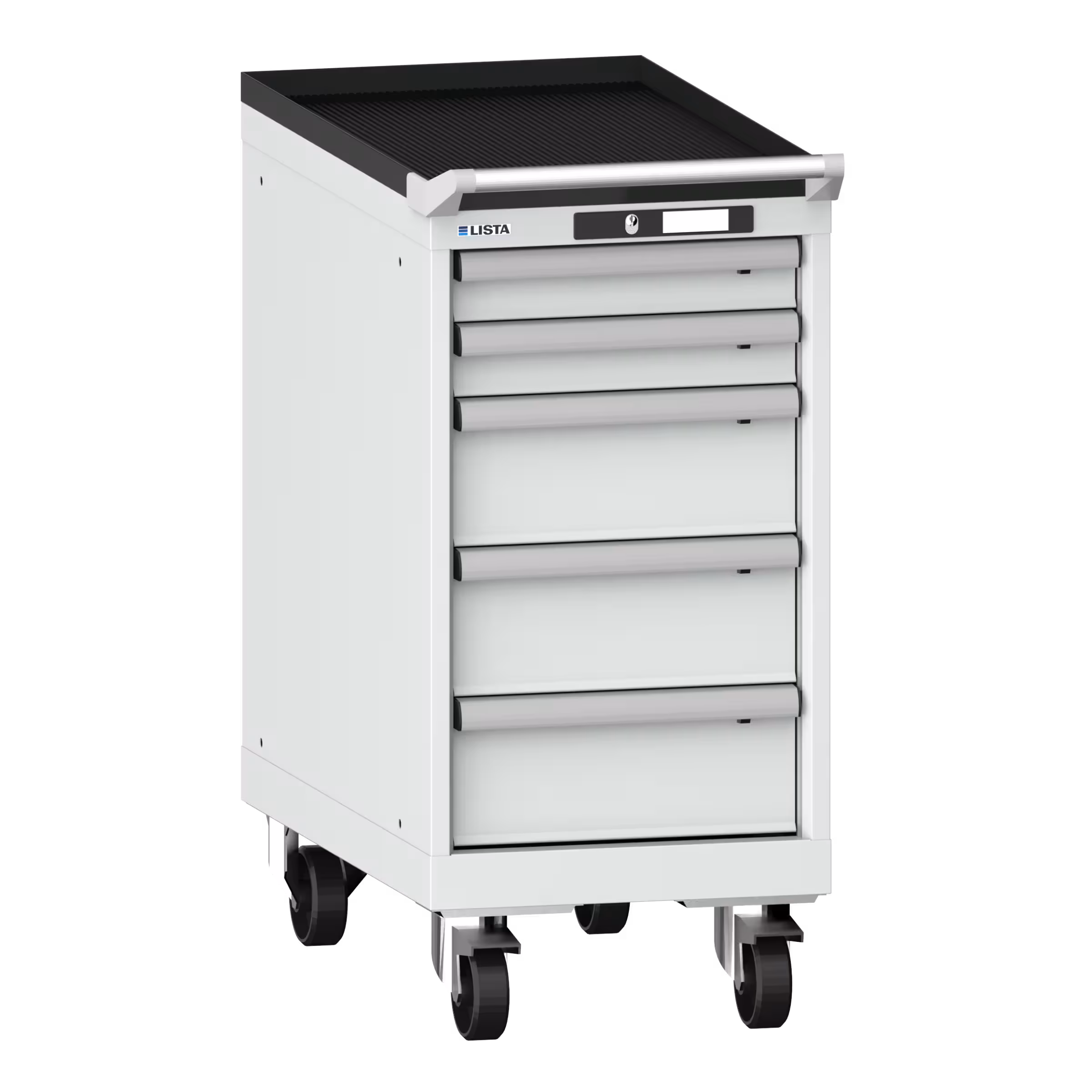 Schubladenschrank mobil 18x36E (BxTxH) 411x725x890mm 5 Schubladen (2x75/3x150) 75kg Nylonrollen Ø100mm KEY Lock Hellgrau NCS S 2000-N