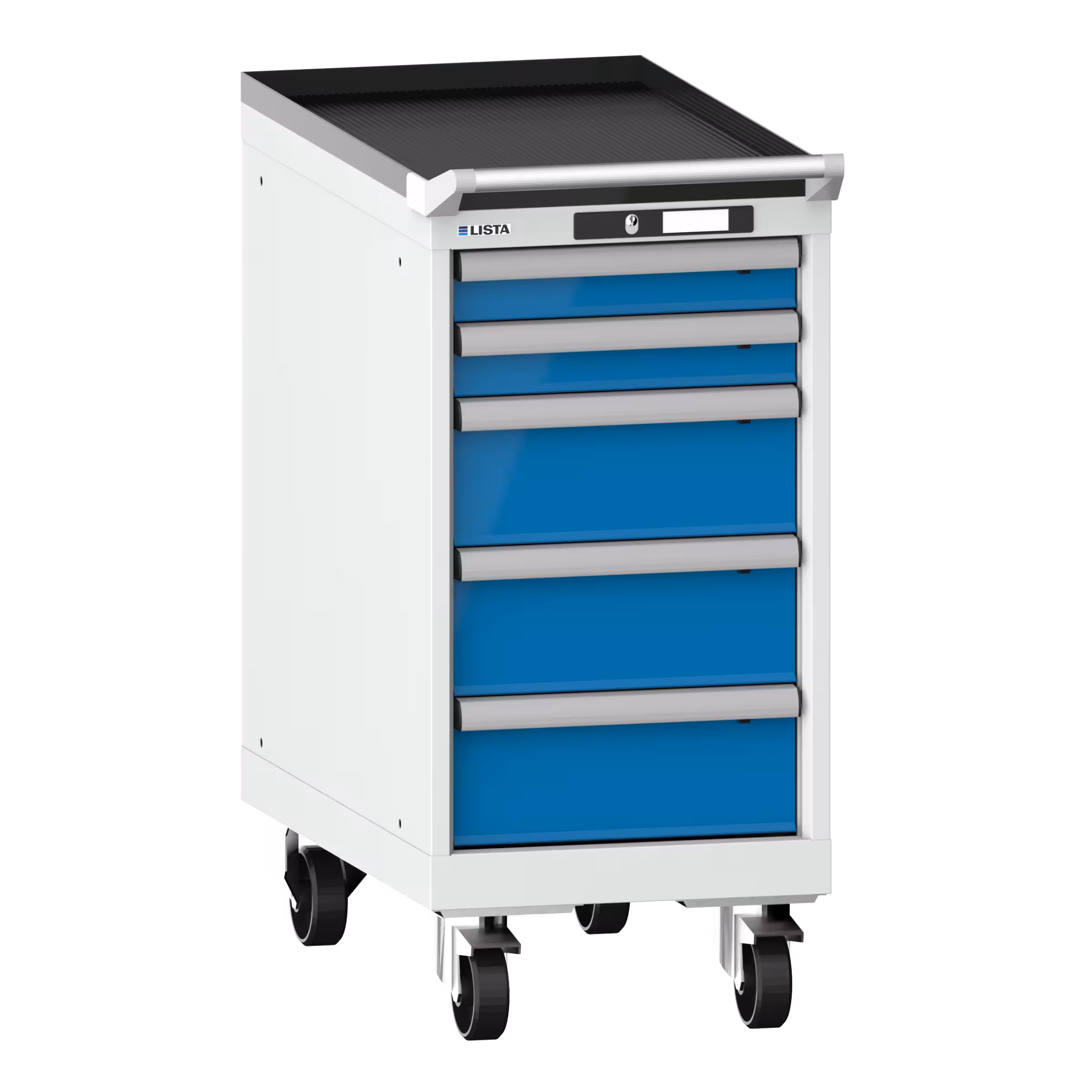 Schubladenschrank mobil 18x36E (BxTxH) 411x725x890mm 5 Schubladen (2x75/3x150) 75kg Nylonrollen Ø100mm KEY Lock Lichtgrau RAL 7035 / Lichtblau RAL 5012