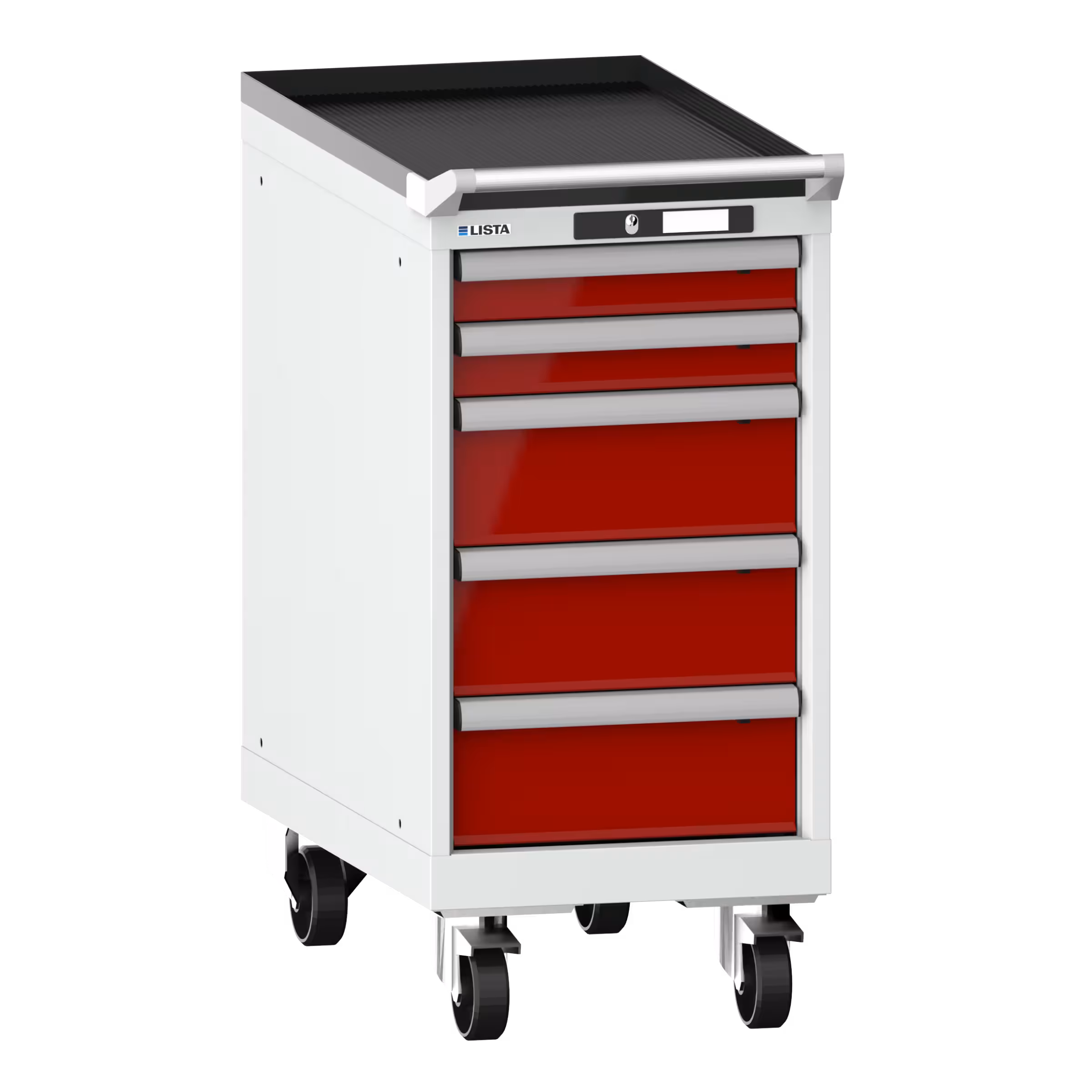 Schubladenschrank mobil 18x36E (BxTxH) 411x725x890mm 5 Schubladen (2x75/3x150) 75kg Nylonrollen Ø100mm KEY Lock Lichtgrau RAL 7035 / Rubinrot RAL 3003