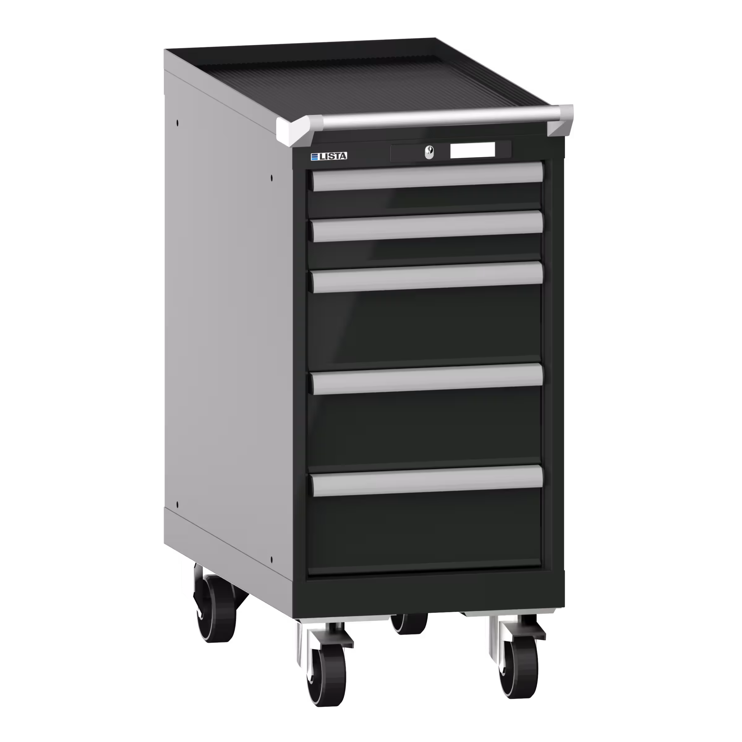 Schubladenschrank mobil 18x36E (BxTxH) 411x725x890mm 5 Schubladen (2x75/3x150) 75kg Nylonrollen Ø100mm KEY Lock Schwarz NCS S 9000-N