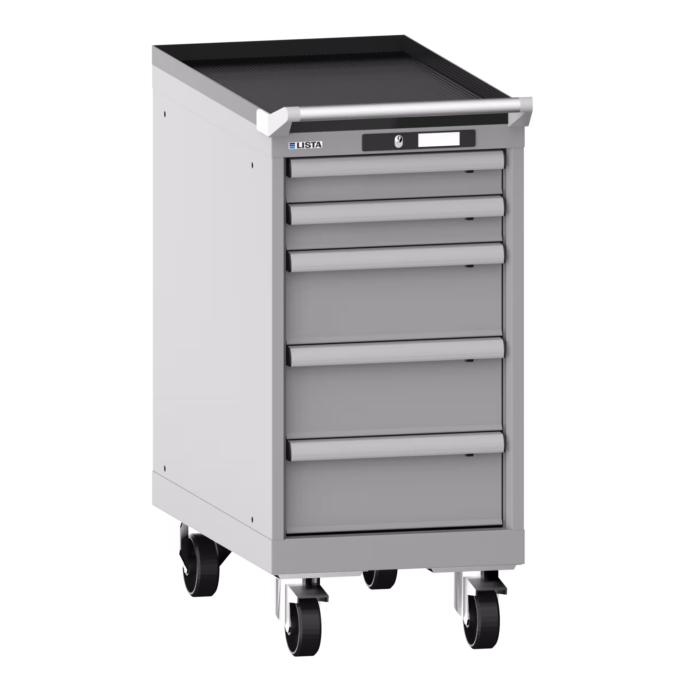 Schubladenschrank mobil 18x36E (BxTxH) 411x725x890mm 5 Schubladen (2x75/3x150) 75kg Nylonrollen Ø100mm KEY Lock Weissaluminium RAL 9006