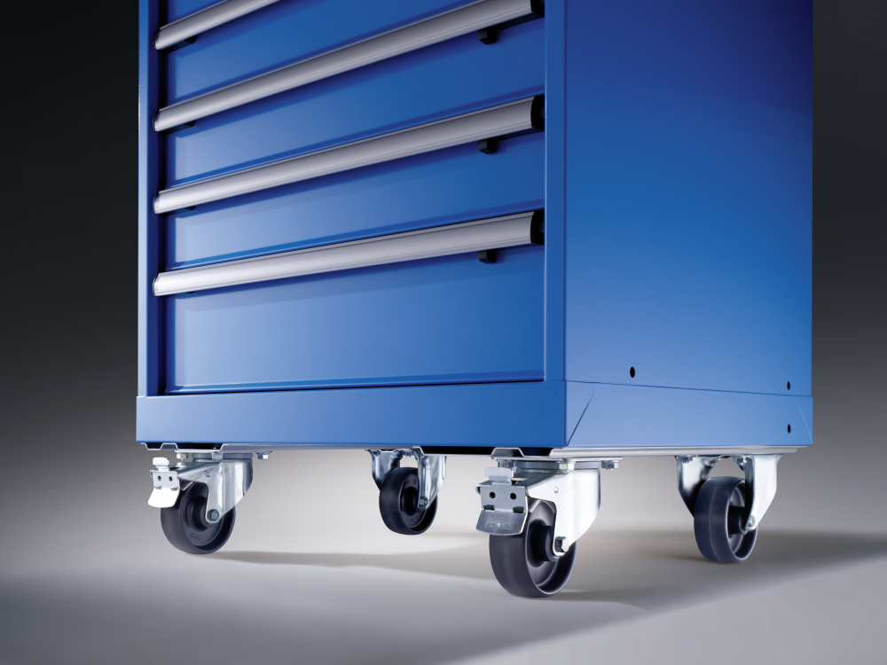 Schubladen-Sicherungen Einzelsicherung rechts: Gilt als Mindestanforderung für fahrbare Schubladenschränke. Einseitig rechts gelagerte Schubladen-Sicherung wird einhändig gelöst und verhindert das ungewollte Öffnen von Schubladen auch bei unverschlossenem Schrank.