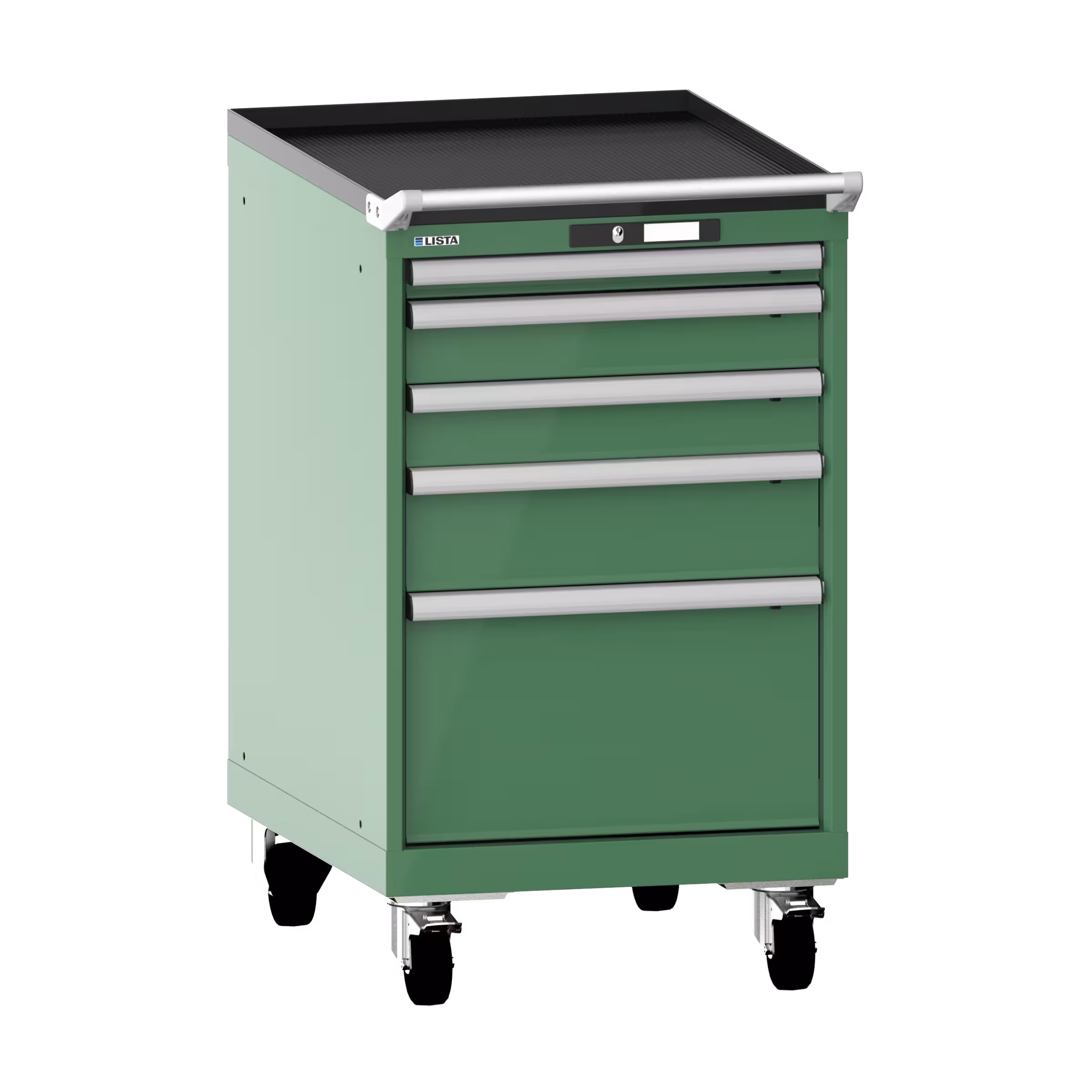 Schubladenschrank mobil 27x36E (BxTxH) 564x725x990mm 5 Schubladen (1x50/2x100/1x150/1x300) 75kg Nylonrollen Ø100mm KEY Lock Resedagrün RAL 6011