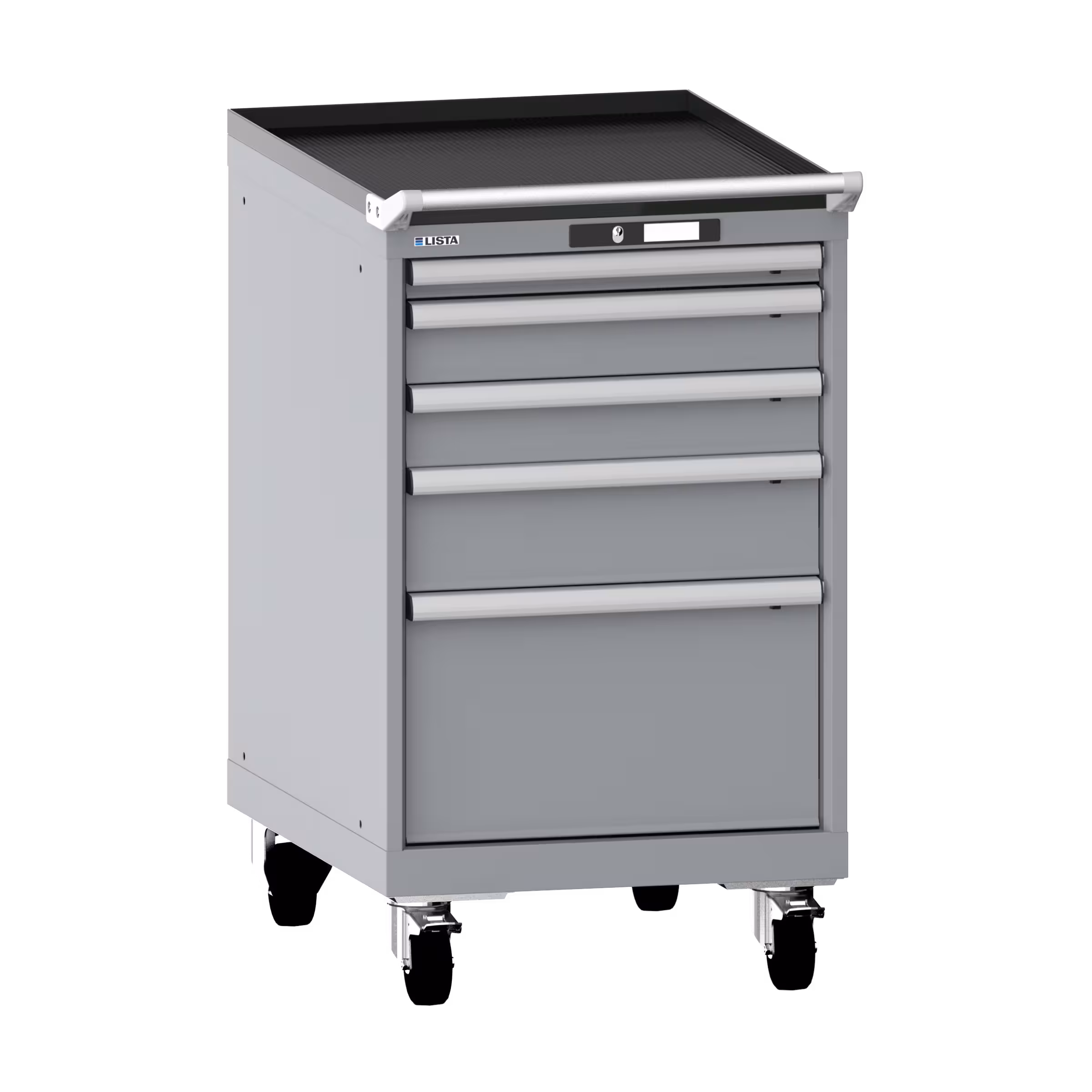 Schubladenschrank mobil 27x36E (BxTxH) 564x725x990mm 5 Schubladen (1x50/2x100/1x150/1x300) 75kg Nylonrollen Ø100mm KEY Lock Taubengrau NCS S 4502-B