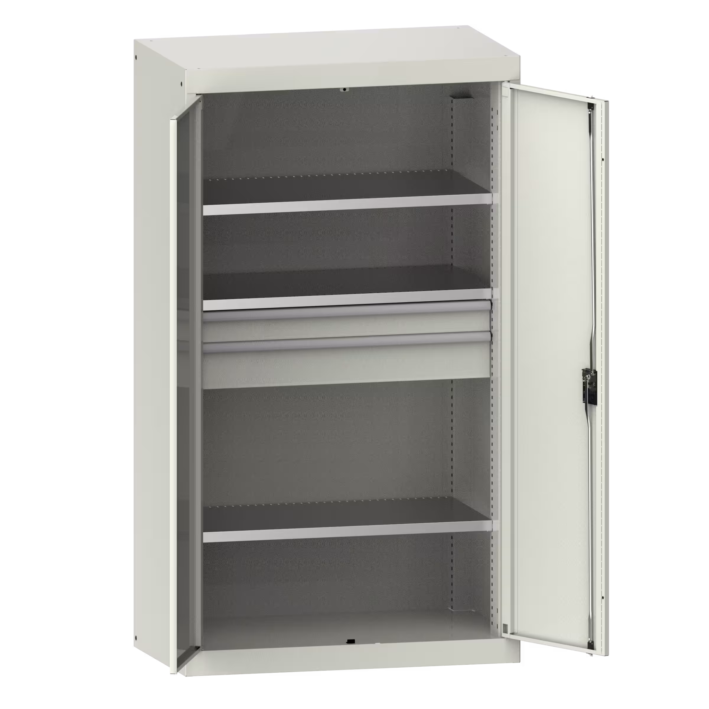 Schwerlastschrank mit 2 Vollblech-Flügeltüren 54x27E (BxTxH) 1100x641x1950mm 3 Verstellböden, 2 Schubladen KEY Lock Grauweiss RAL 9002