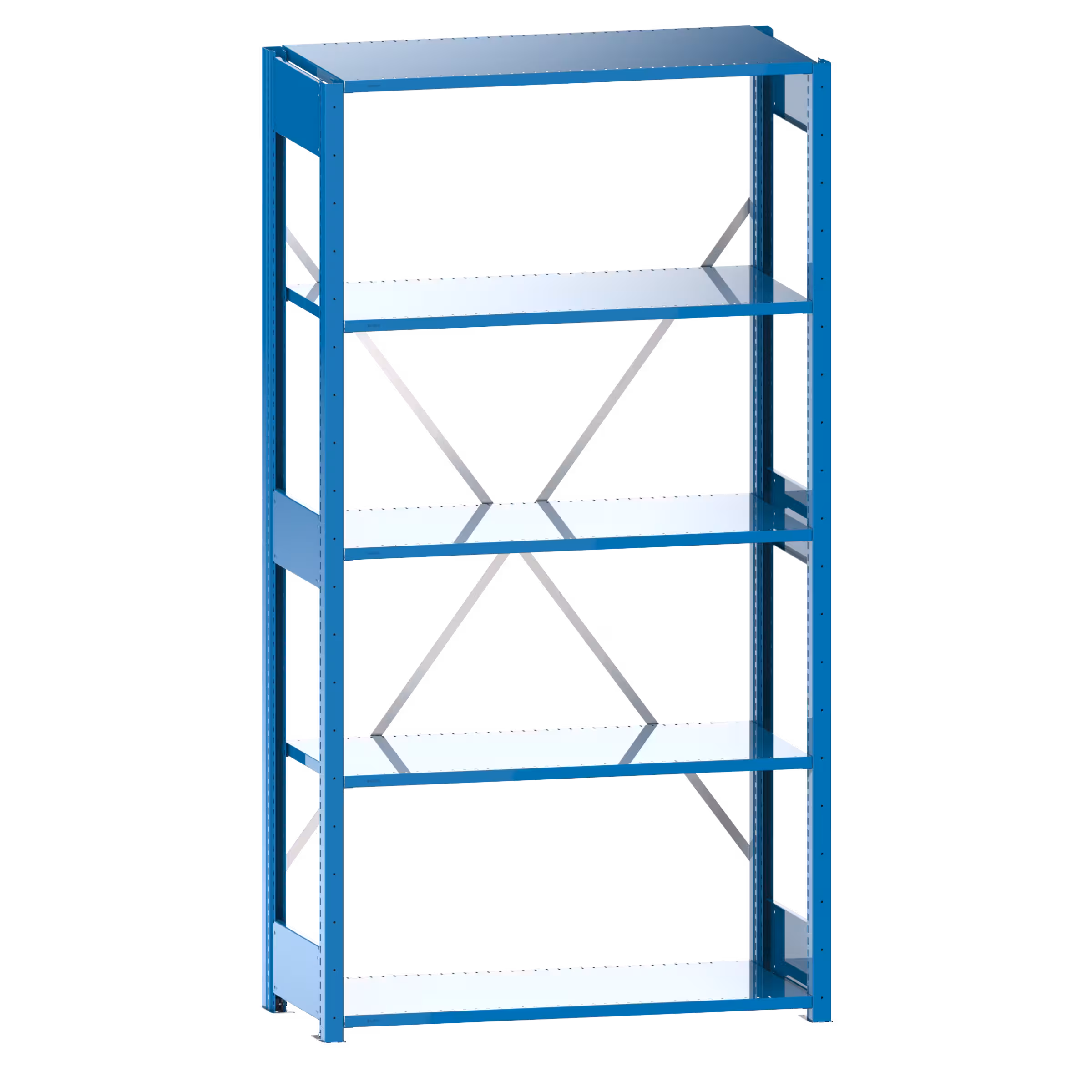 2 Regalstützenpaare inkl. 6 Tiefenstreben, 1 Diagonalkreuz verzinkt, Fachböden geschlitzt (Stärke 25 mm)