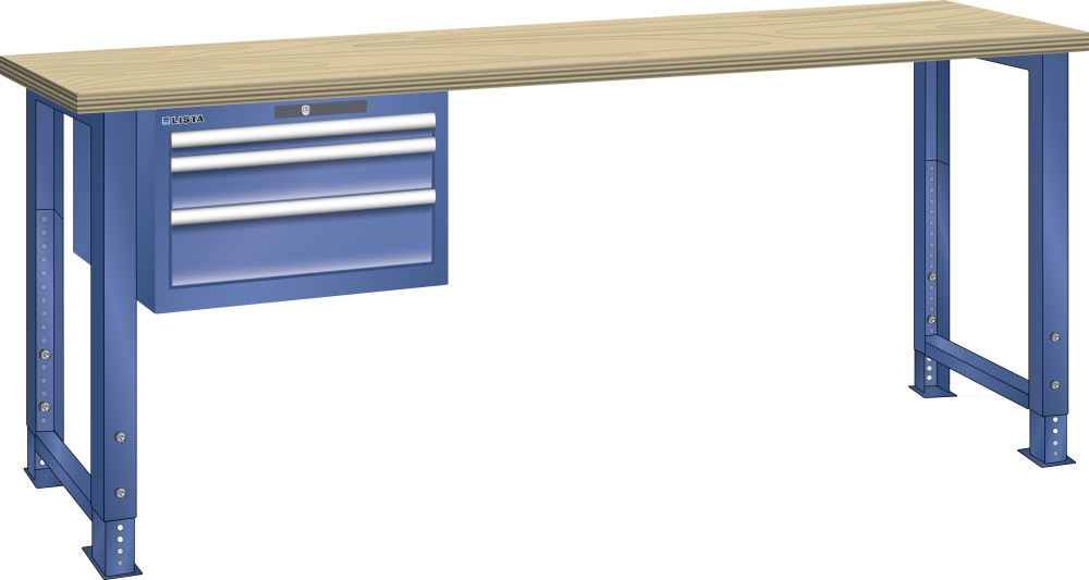 Werkbank 27x36E (BxTxH) 1500x800x750-1100mm 3 Schubladen (1x50/1x100/1x150) 75kg Buche RFID Lock Enzianblau RAL 5010