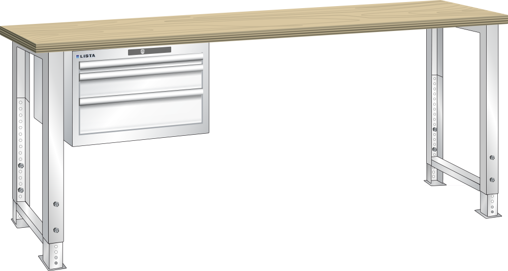 Werkbänke: Mit Multiplex- oder Buchenplatte inklusive Vormontage und Befestigungsmaterial. Schubladenschrank sowohl rechts als auch links montierbar.
