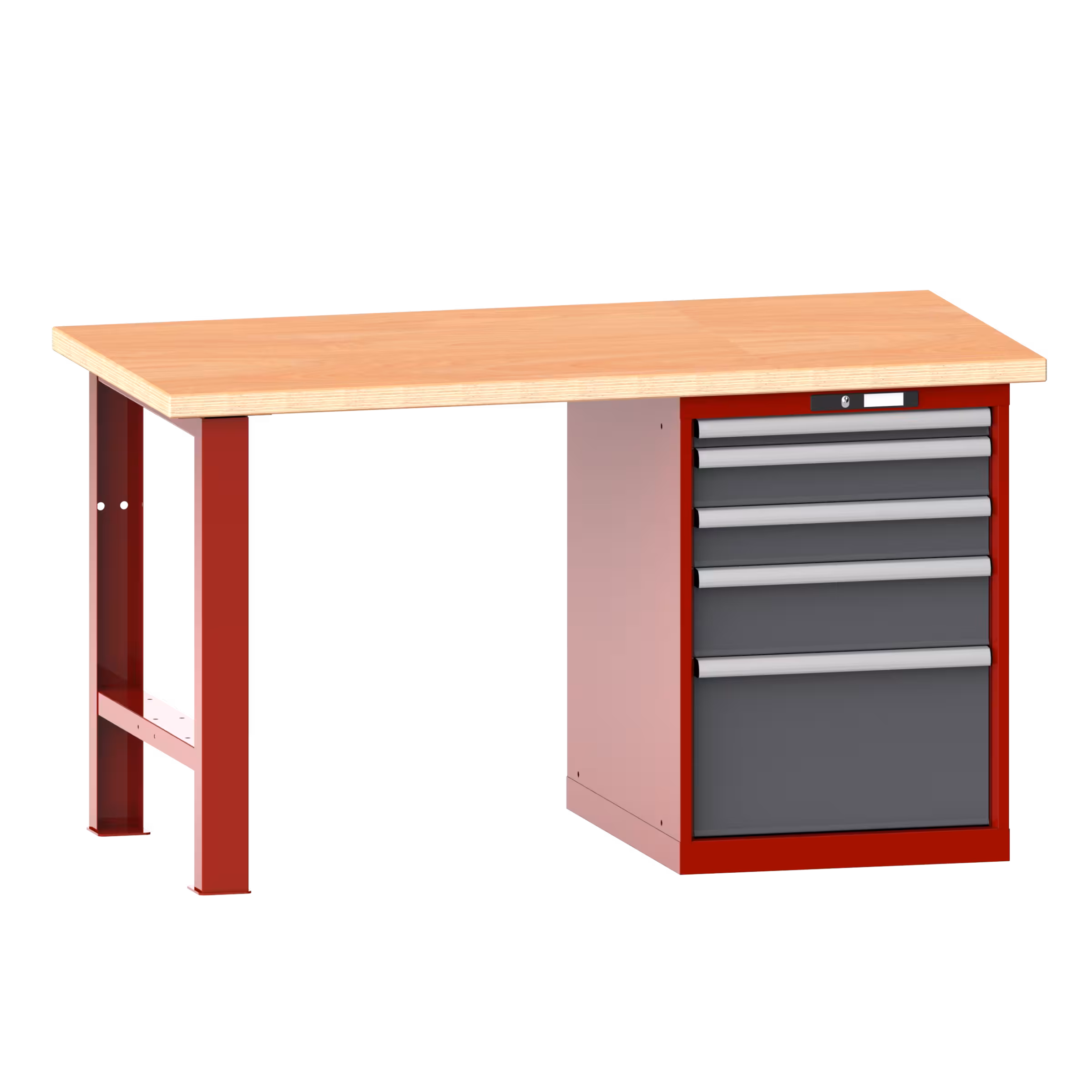 Werkbank 27x36E (BxTxH) 2000x750x840mm 5 Schubladen (1x50/2x100/1x150/1x300) 75kg Multiplex KEY Lock Rubinrot RAL 3003/Grau metallic NCS S 6502-B