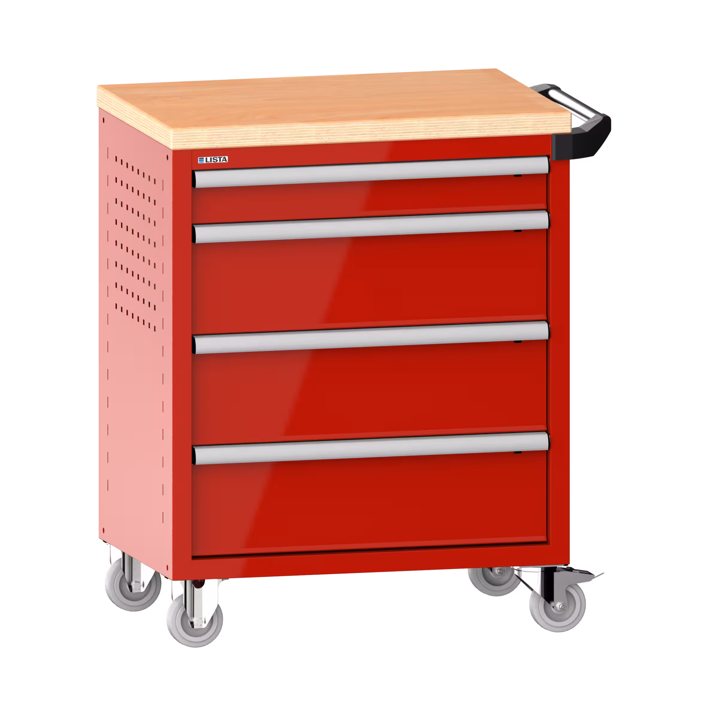 Werkstattwagen 36x27E (BxTxH) 833x525x945mm 4 Schubladen (1x100/3x200) 40kg mit Holzabdeckung Einzelsicherung rechts KEY Lock Feuerrot RAL 3000