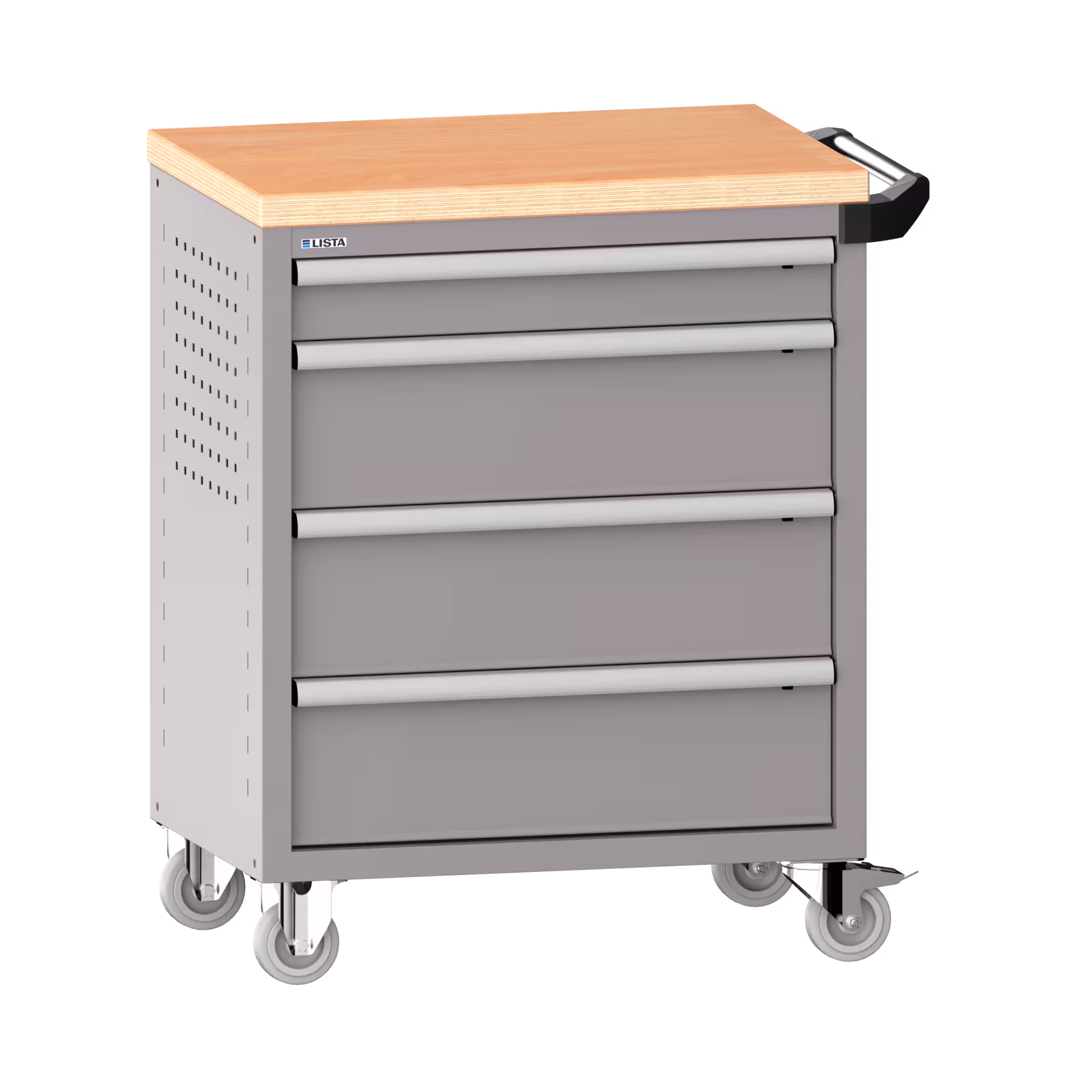 Werkstattwagen 36x27E (BxTxH) 833x525x945mm 4 Schubladen (1x100/3x200) 40kg mit Holzabdeckung Einzelsicherung rechts KEY Lock Graualuminium RAL 9007