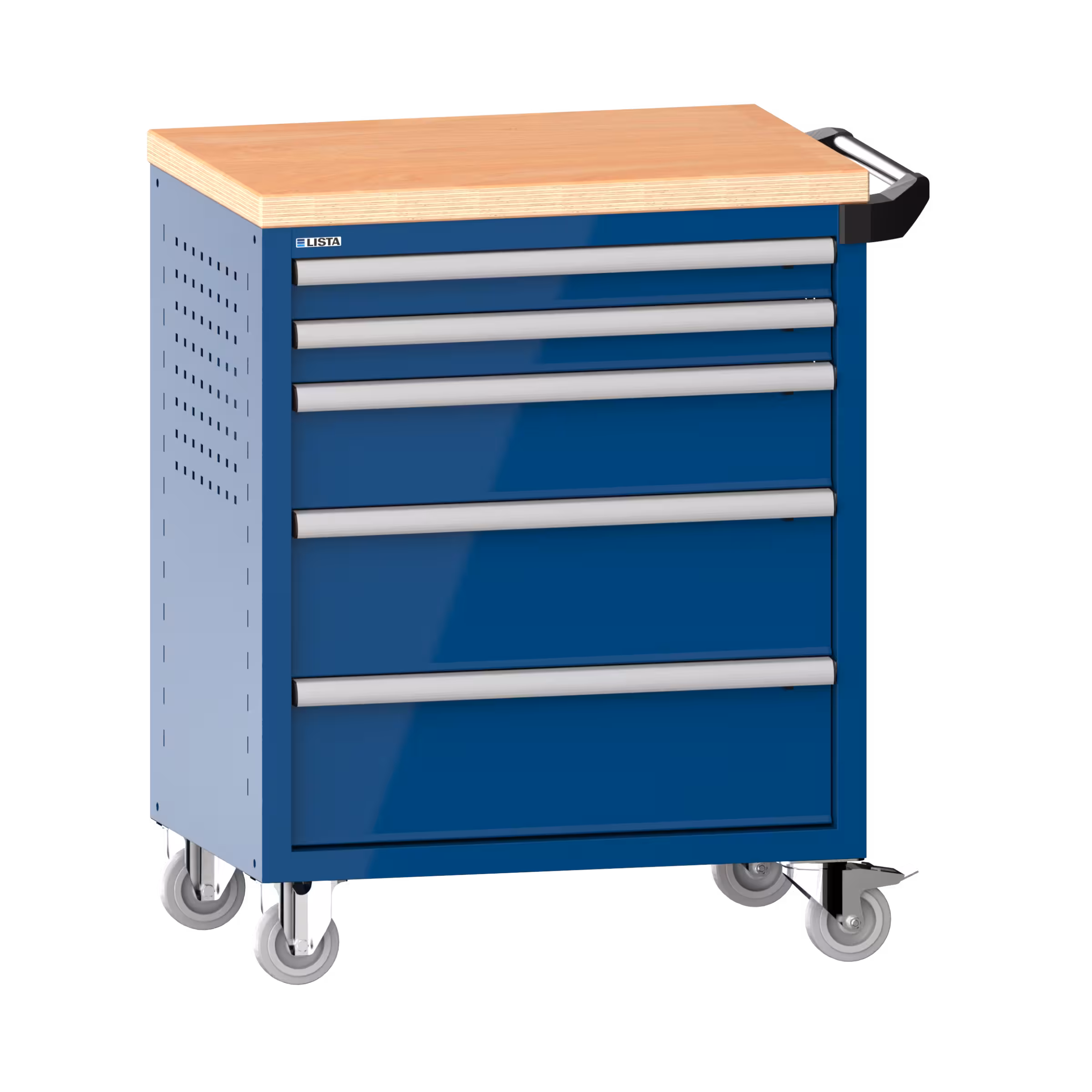 Werkstattwagen 36x27E (BxTxH) 833x525x945mm 5 Schubladen (2x75/1x150/2x200) 40kg mit Holzabdeckung Einzelsicherung rechts KEY Lock Enzianblau RAL 5010