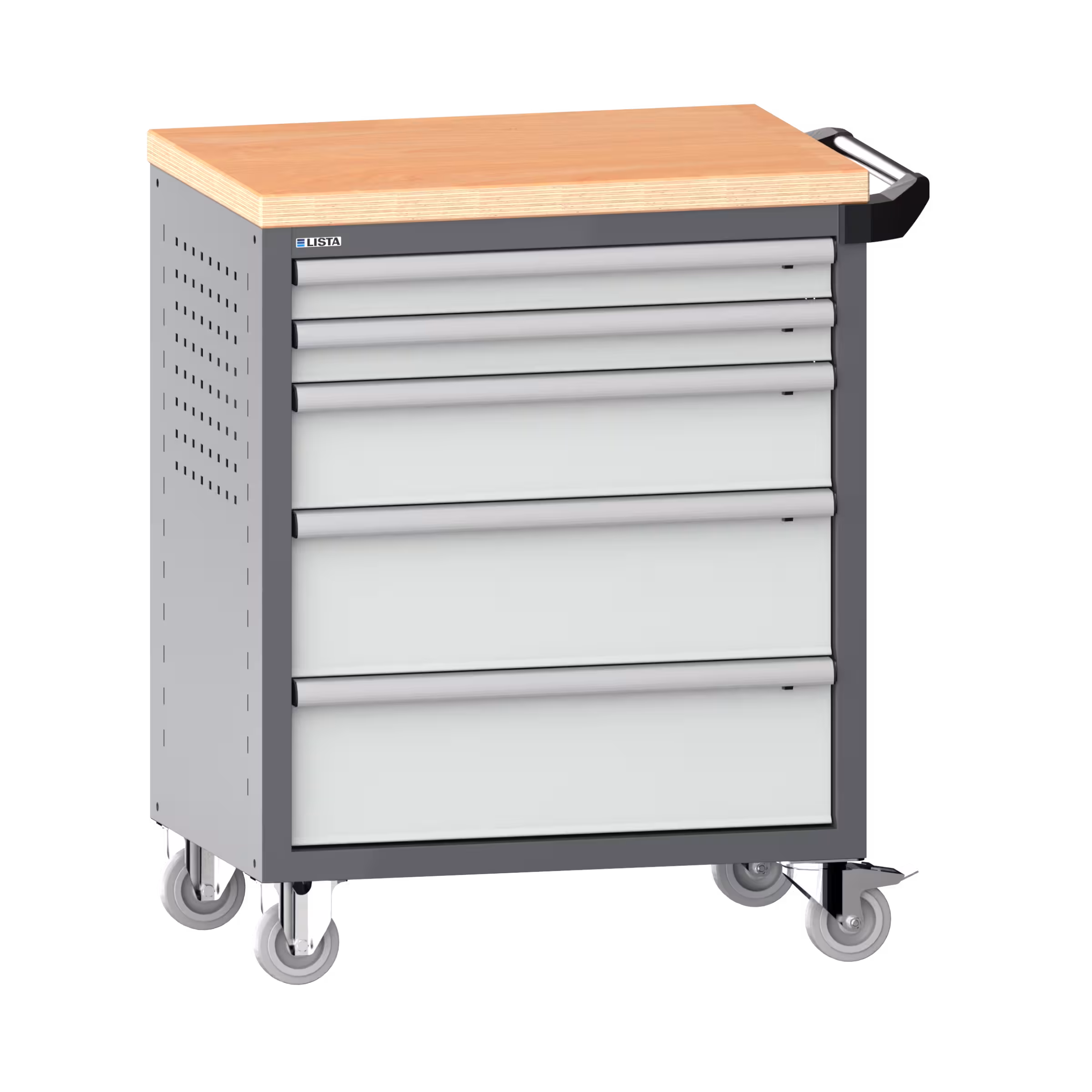 Werkstattwagen 36x27E (BxTxH) 833x525x945mm 5 Schubladen (2x75/1x150/2x200) 40kg mit Holzabdeckung Einzelsicherung rechts KEY Lock Grau metallic NCS S 6502-B / Lichtgrau RAL 7035