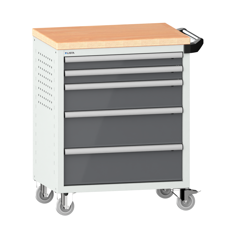 Werkstattwagen 36x27E (BxTxH) 833x525x945mm 5 Schubladen (2x75/1x150/2x200) 40kg mit Holzabdeckung Einzelsicherung rechts KEY Lock Lichtgrau RAL 7035 / Grau metallic NCS S 6502-B