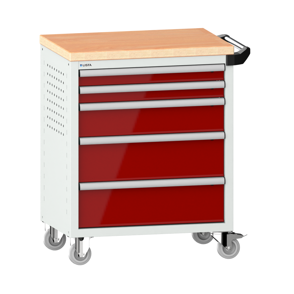 Werkstattwagen 36x27E (BxTxH) 833x525x945mm 5 Schubladen (2x75/1x150/2x200) 40kg mit Holzabdeckung Einzelsicherung rechts KEY Lock Lichtgrau RAL 7035 / Rubinrot RAL 3003