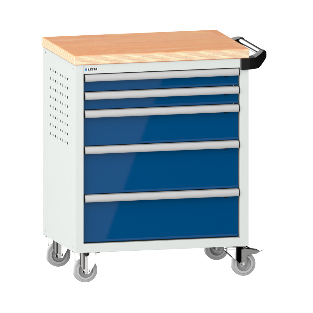 Werkstattwagen 36x27E (BxTxH) 833x525x945mm 5 Schubladen (2x75/1x150/2x200) 40kg mit Holzabdeckung Einzelsicherung rechts KEY Lock Lichtgrau RAL 7035 / Signalblau RAL 5005