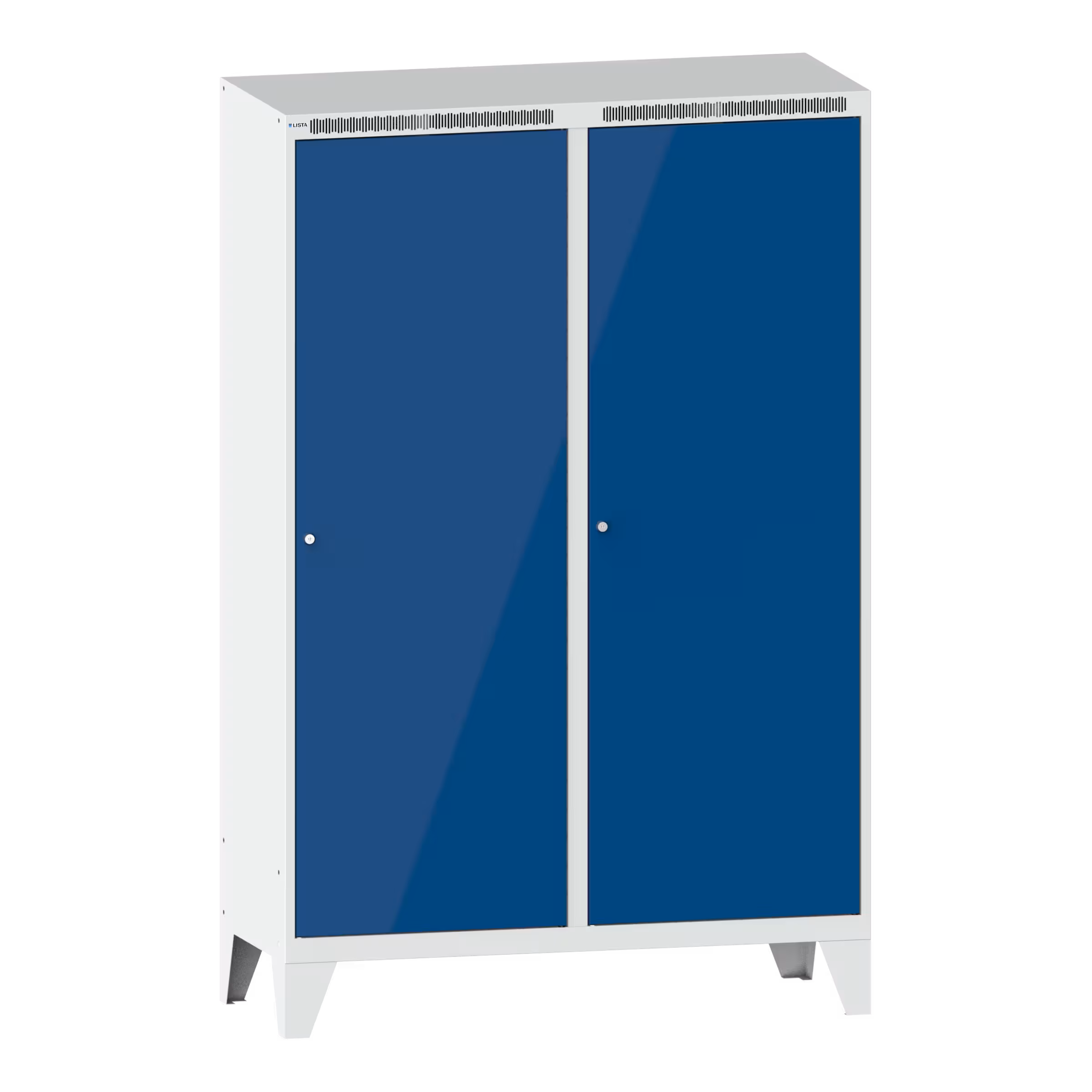 Clothes locker (WxDxH) 1200x500x1850mm 4 compartments with feet, plain doors, KEY Lock Light grey RAL 7035 / Signal blue RAL 5005