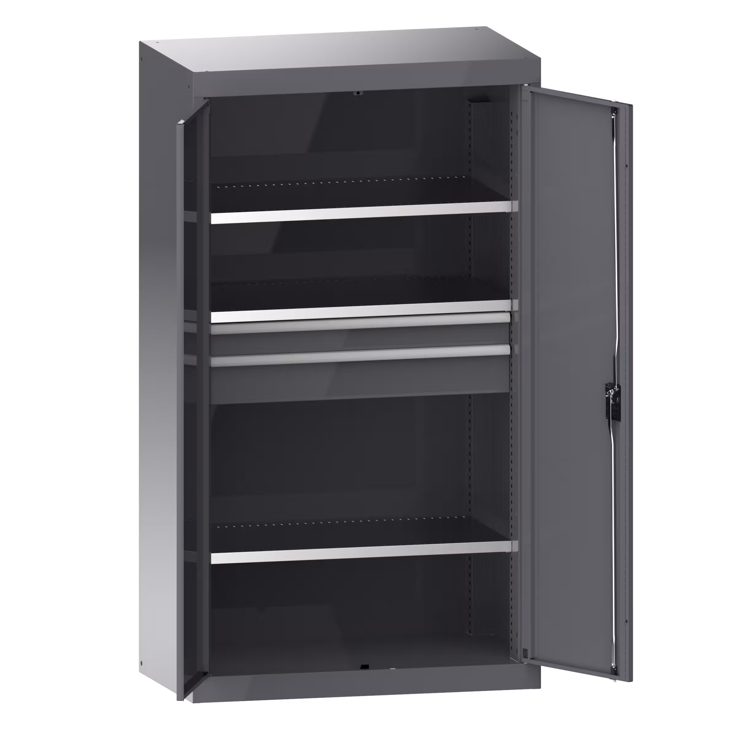 Heavy-duty cabinets with hinged doors: The cabinets are fitted with: adjustable shelves, galvanised, 35 mm thick, pull-out shelves and drawers, painted, generally grey, NCS 4502-B. Hinged doors folded from one piece, optionally either in solid sheet or with viewing windows. KEY, CODE or RFID locks available.