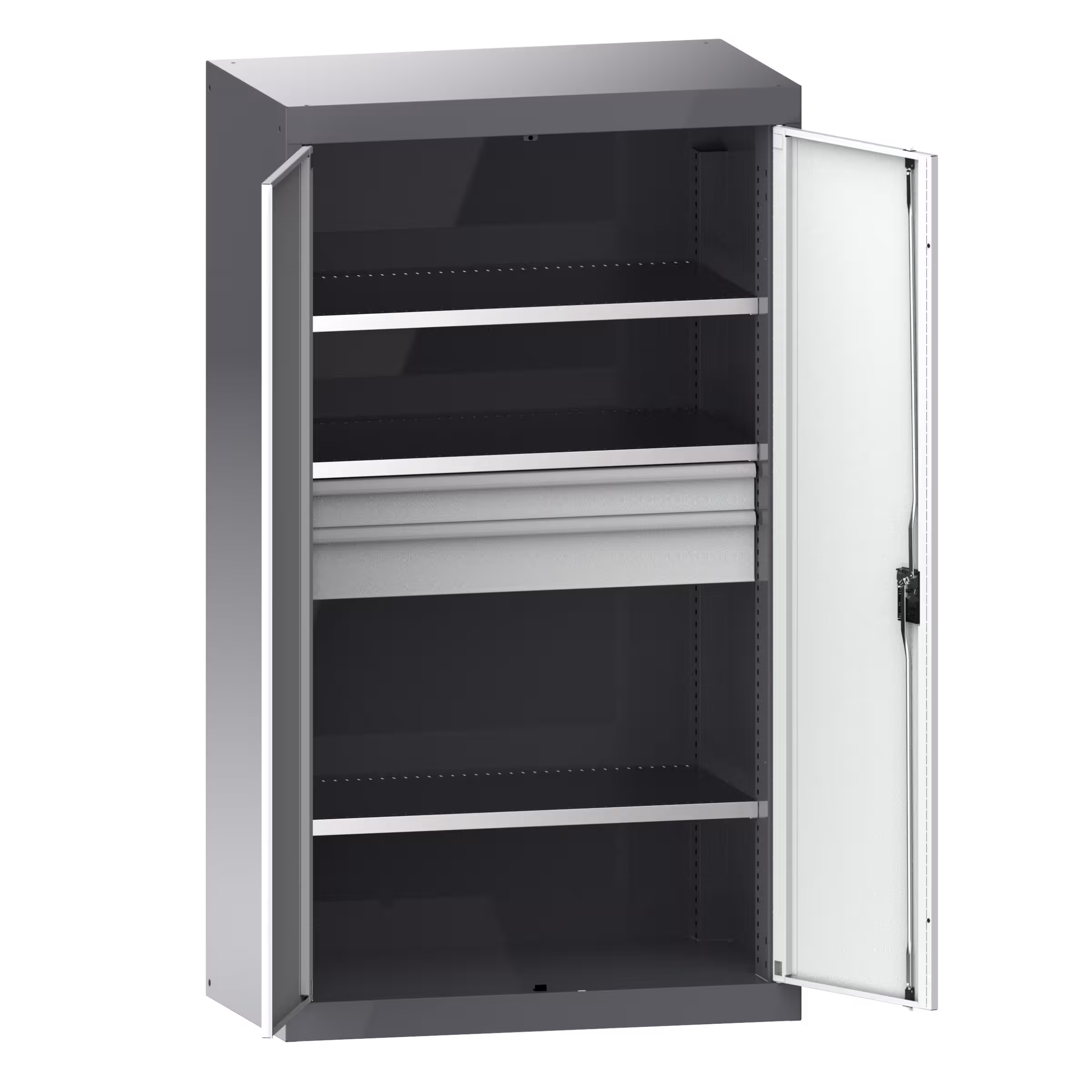 Heavy-duty cabinets with hinged doors: The cabinets are fitted with: adjustable shelves, galvanised, 35 mm thick, pull-out shelves and drawers, painted, generally grey, NCS 4502-B. Hinged doors folded from one piece, optionally either in solid sheet or with viewing windows. KEY, CODE or RFID locks available.
