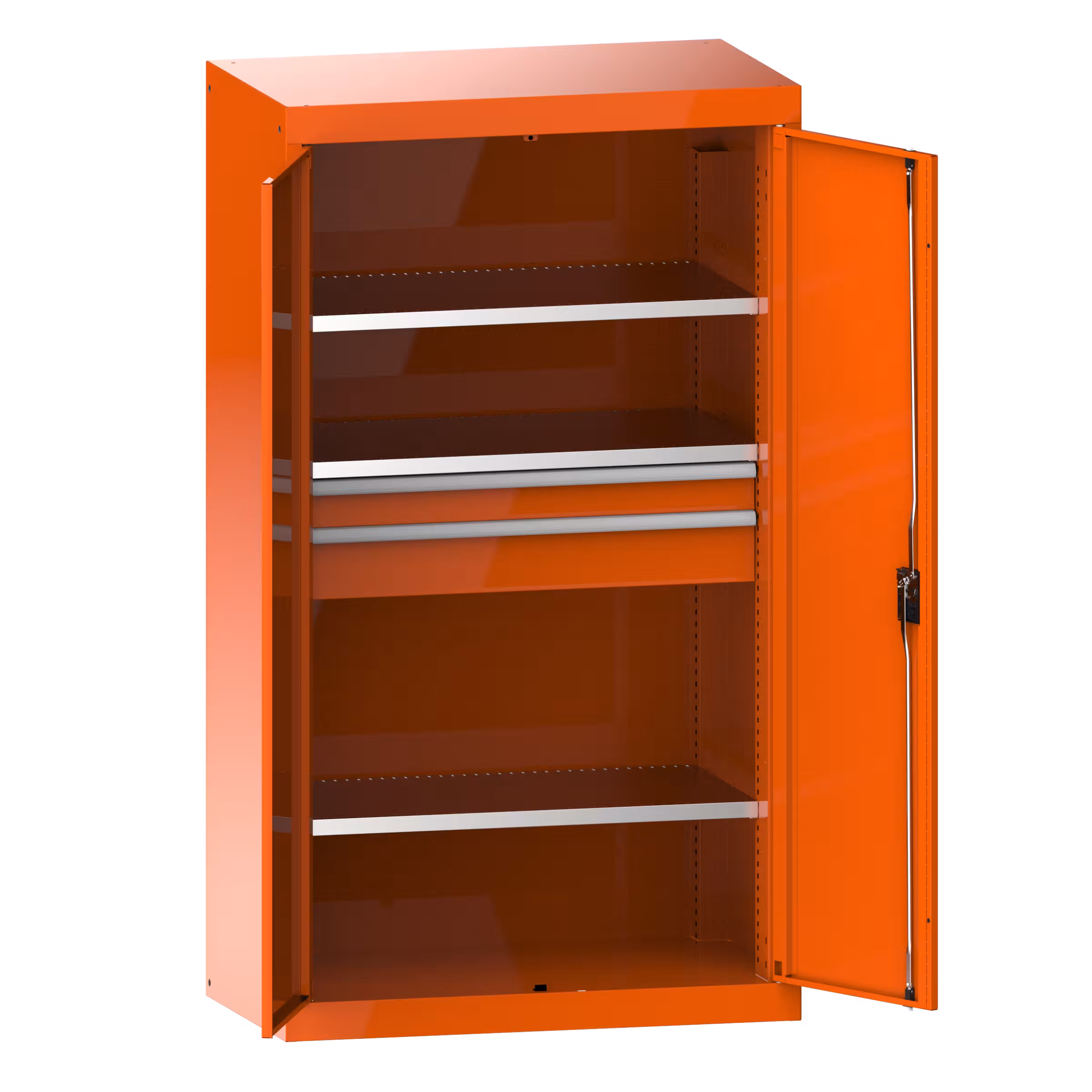 Heavy-duty cabinet with solid sheet hinged doors 54x27E (WxDxH) 1100x641x1950mm 3 shelves, 2 drawers KEY Lock Orange RAL 2004