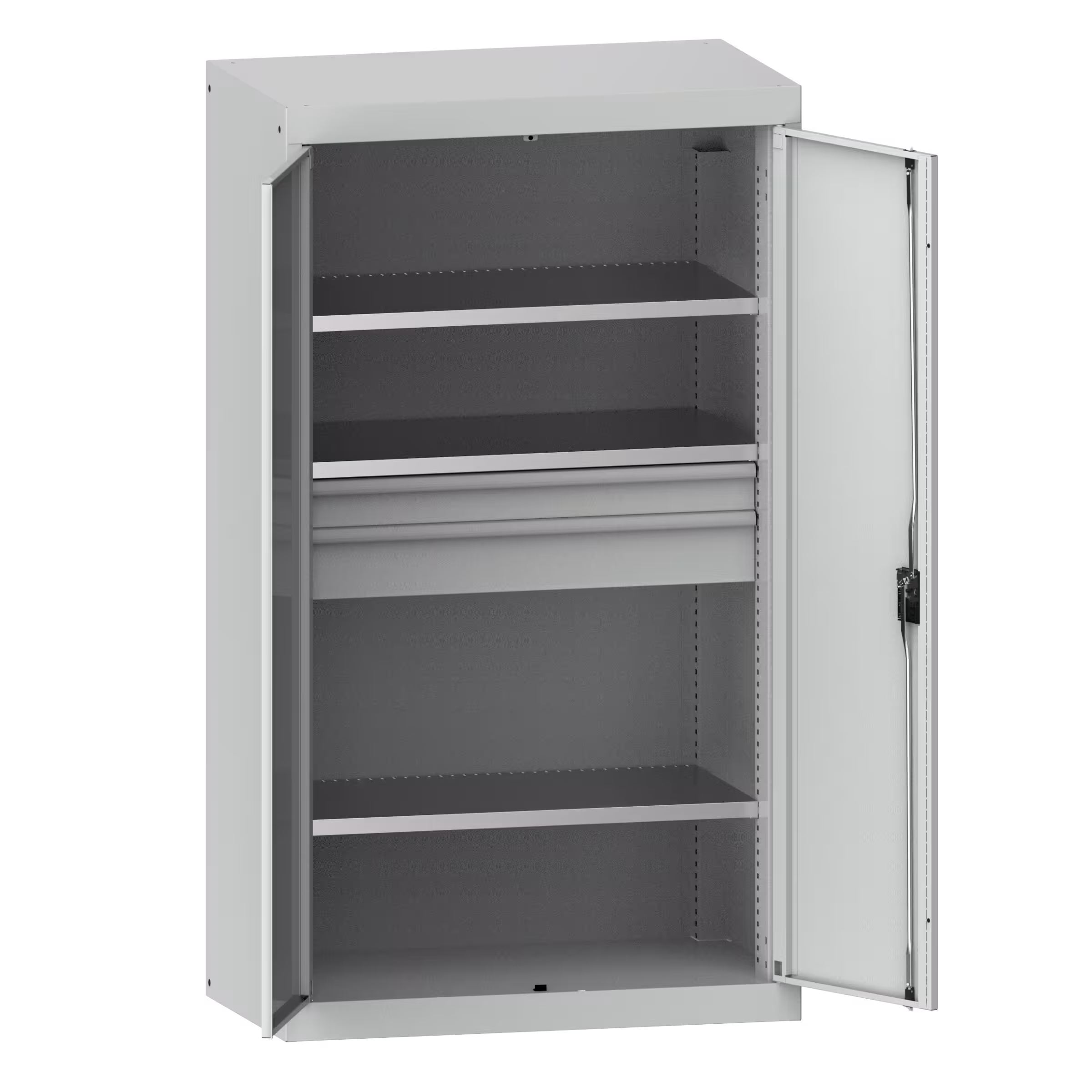 Heavy-duty cabinet with solid sheet hinged doors 54x27E (WxDxH) 1100x641x1950mm 3 shelves, 2 drawers KEY Lock Pale grey NCS S 2000-N