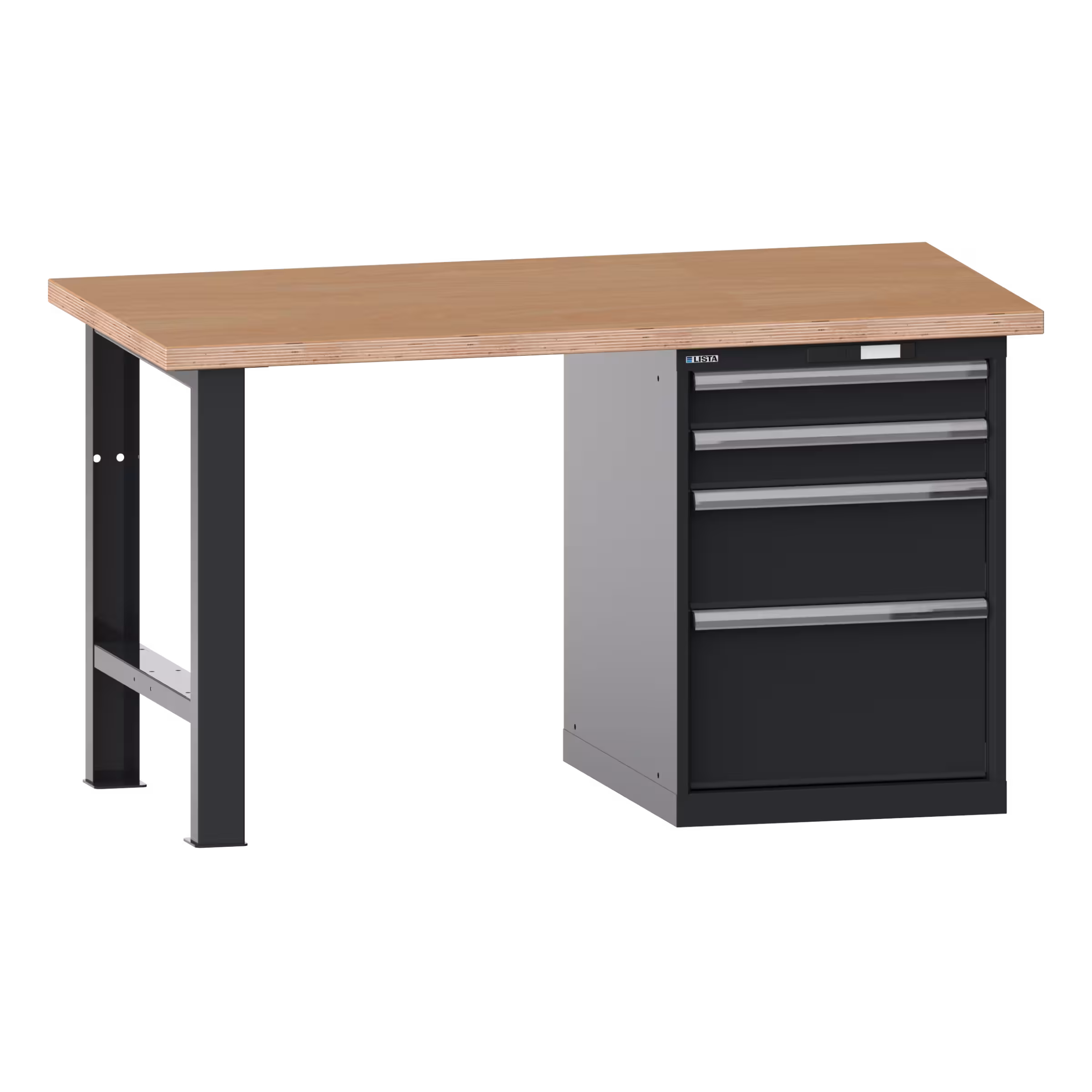 Workbenches: With multiplex or beech top including pre-assembly and fastening material. Drawer cabinet can be fitted on either the right or the left.
